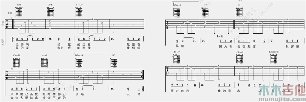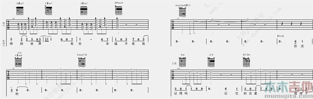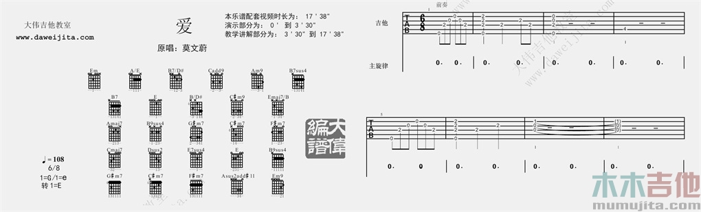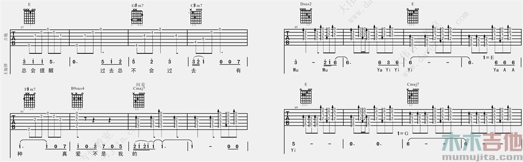 曲谱介绍: 莫文蔚《爱》吉他弹唱谱,采用G调指法编配,共有8张高清图谱。