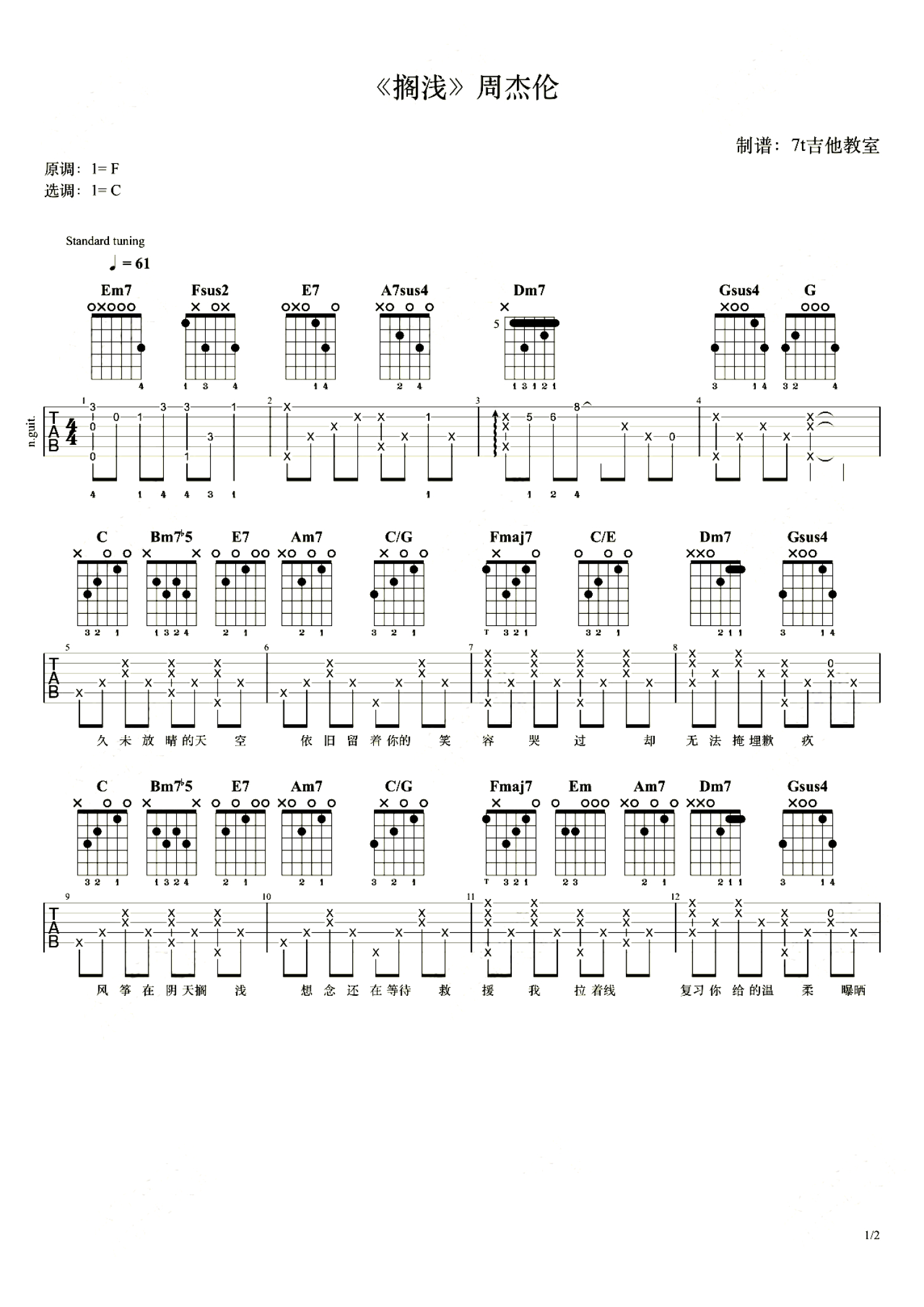 曲谱介绍: 搁浅吉他谱,周杰伦演唱的一首典型情歌代表作品,搁浅六线谱,原调F选调C,风筝在阴天搁浅,想念还在等待救援,你在夜里循环过多少遍《搁浅》?老师演奏说明:这首歌的原调是F大调,视频里采用C大调的指法来编配,使用变调夹第5品,弹出来就是原调了!琴友们弹奏时候如果觉得调子太高,也可以夹少一点或者不夹~
