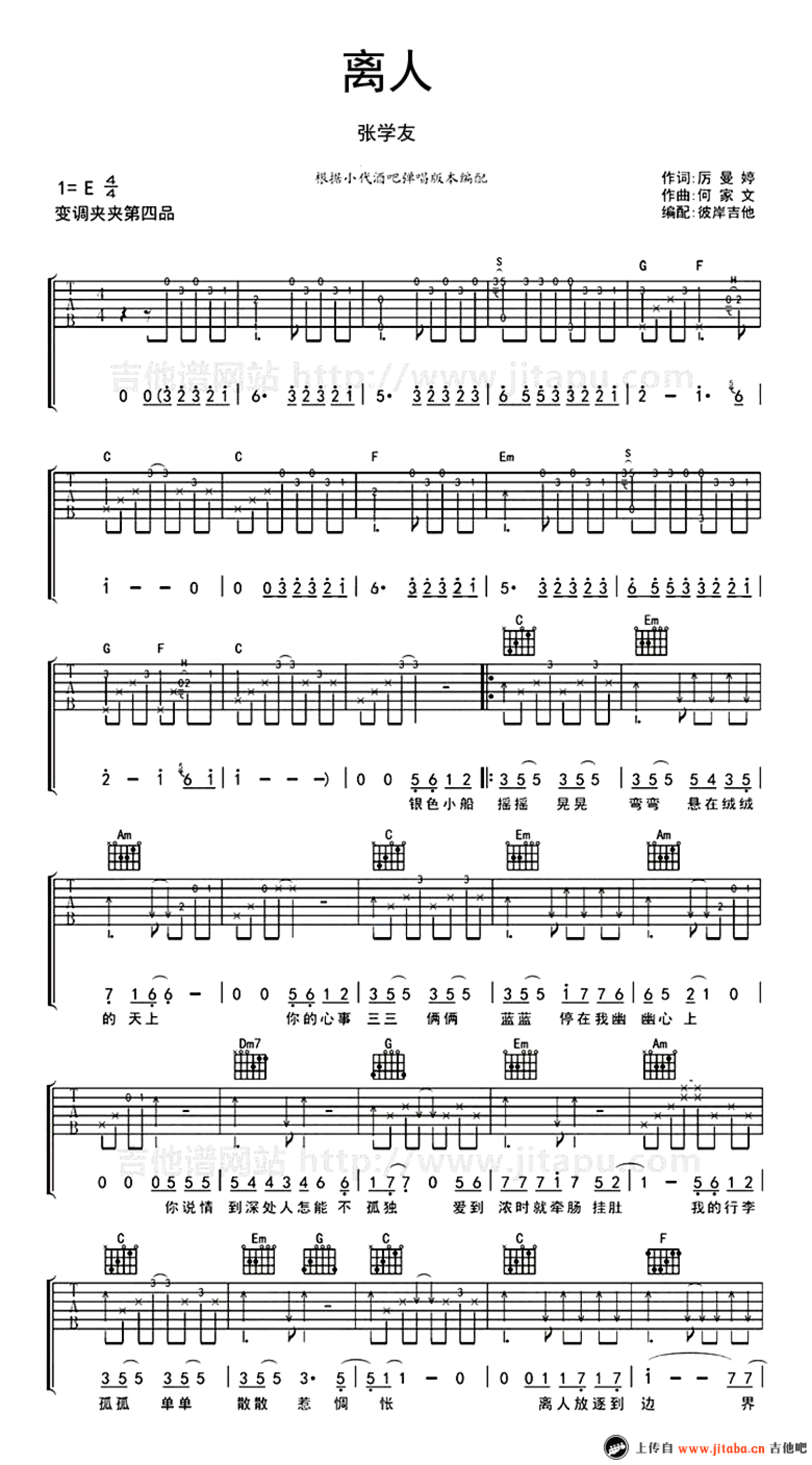 曲谱介绍: 张学友《离人》吉他谱,变调夹夹四品。悠悠荡荡的旋律,起伏绵长的歌声,总是会让人脑海中浮现出星光满天的画面。歌声太美,思念太深,随着歌声的婉转追忆离人,跟着流动的旋律感慨人生,悼念令人伤感的回忆……