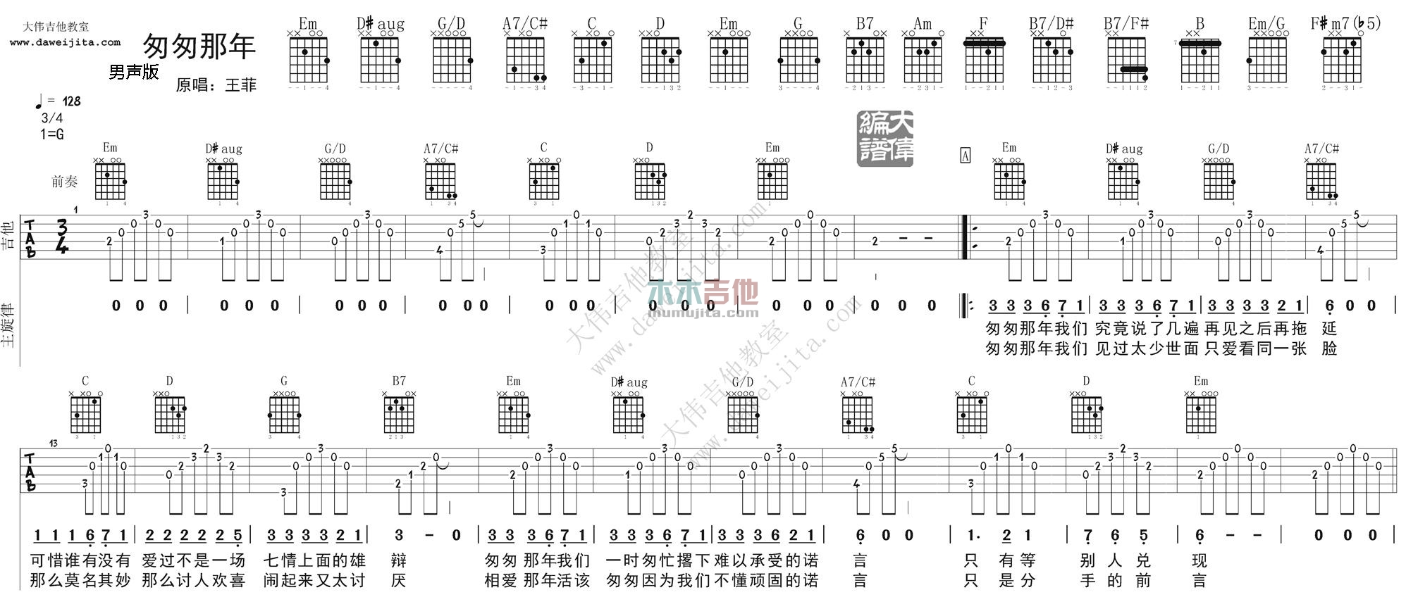 曲谱介绍: 王菲《匆匆那年》吉他弹唱谱,采用G调指法编配,共有3张高清图谱。