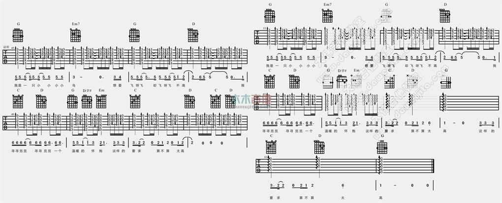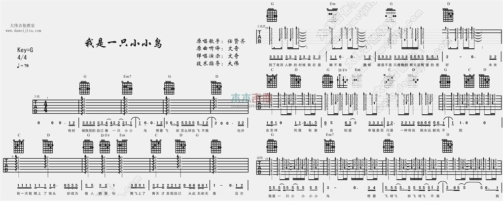 曲谱介绍: 任贤齐《我是一只小小鸟》吉他弹唱谱,采用G调指法编配,共有3张高清图谱。