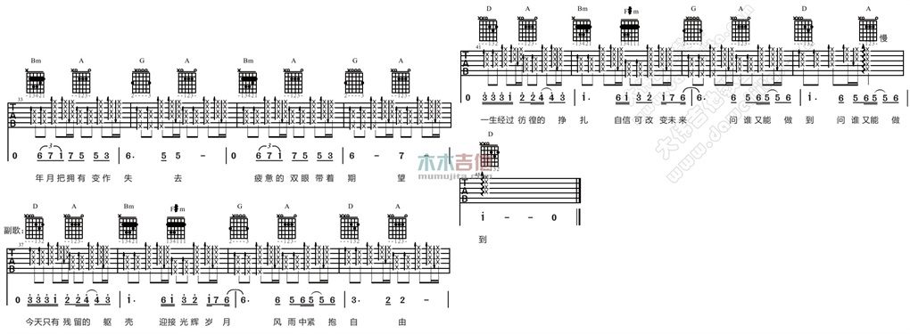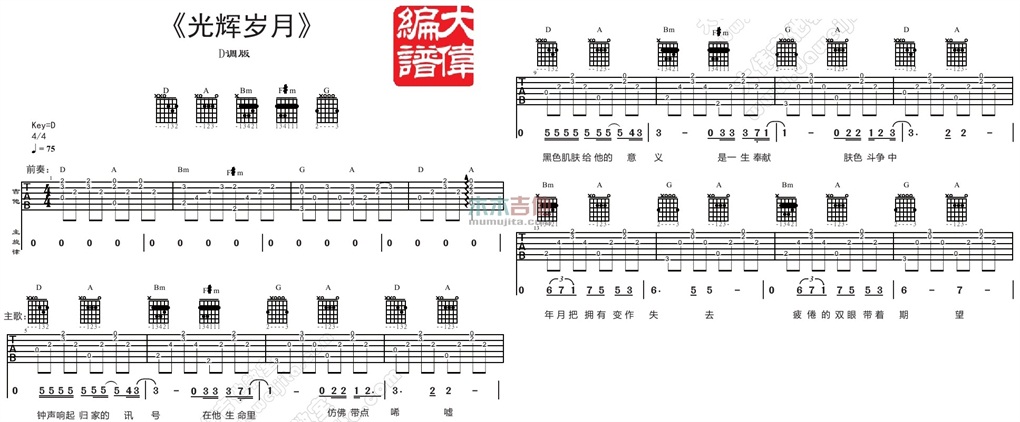 曲谱介绍: Beyond《光辉岁月》吉他弹唱谱,采用D调指法编配,共有3张高清图谱。