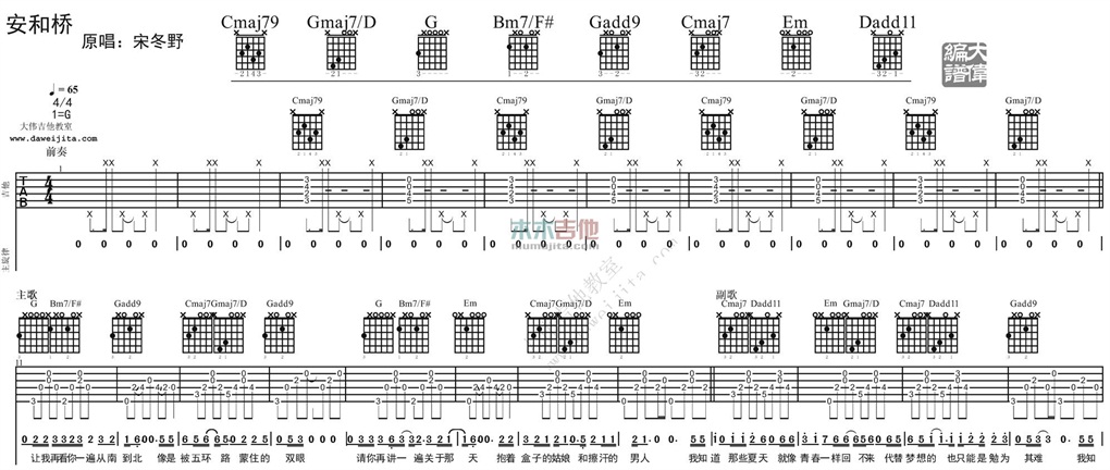 曲谱介绍: 宋冬野《安和桥》吉他弹唱谱,采用G调指法编配,共有3张高清图谱。