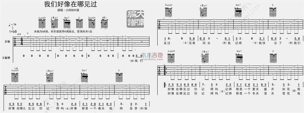 曲谱介绍: 小柯,叶蓓《我们好像在哪见过》吉他弹唱谱,采用B调指法编配,共有3张高清图谱。