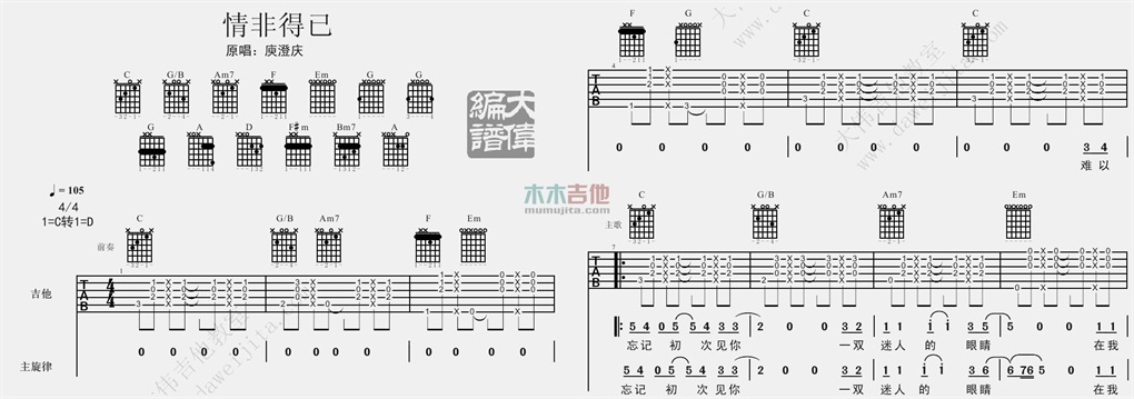 曲谱介绍: 庾澄庆《情非得已》吉他弹唱谱,采用D调指法编配,共有5张高清图谱。