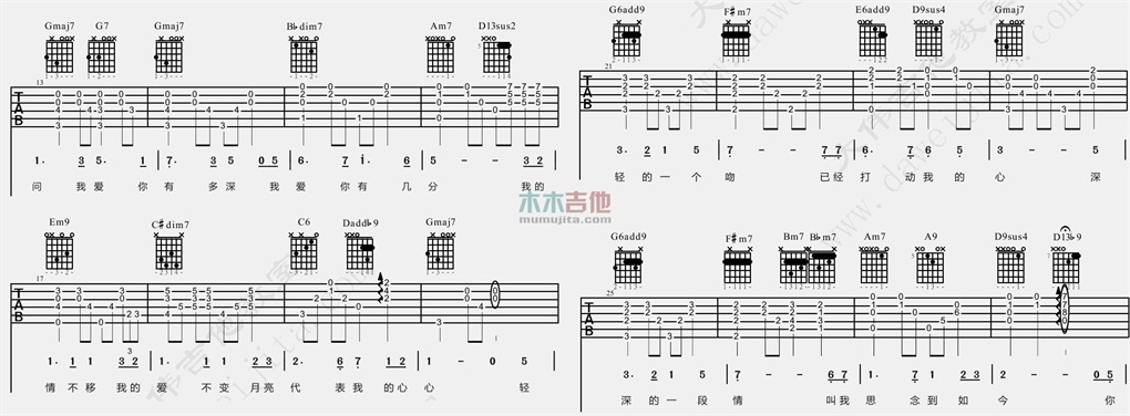 月亮代表我的心 爵士版吉他谱 - 邓丽君 - G调吉他弹唱谱