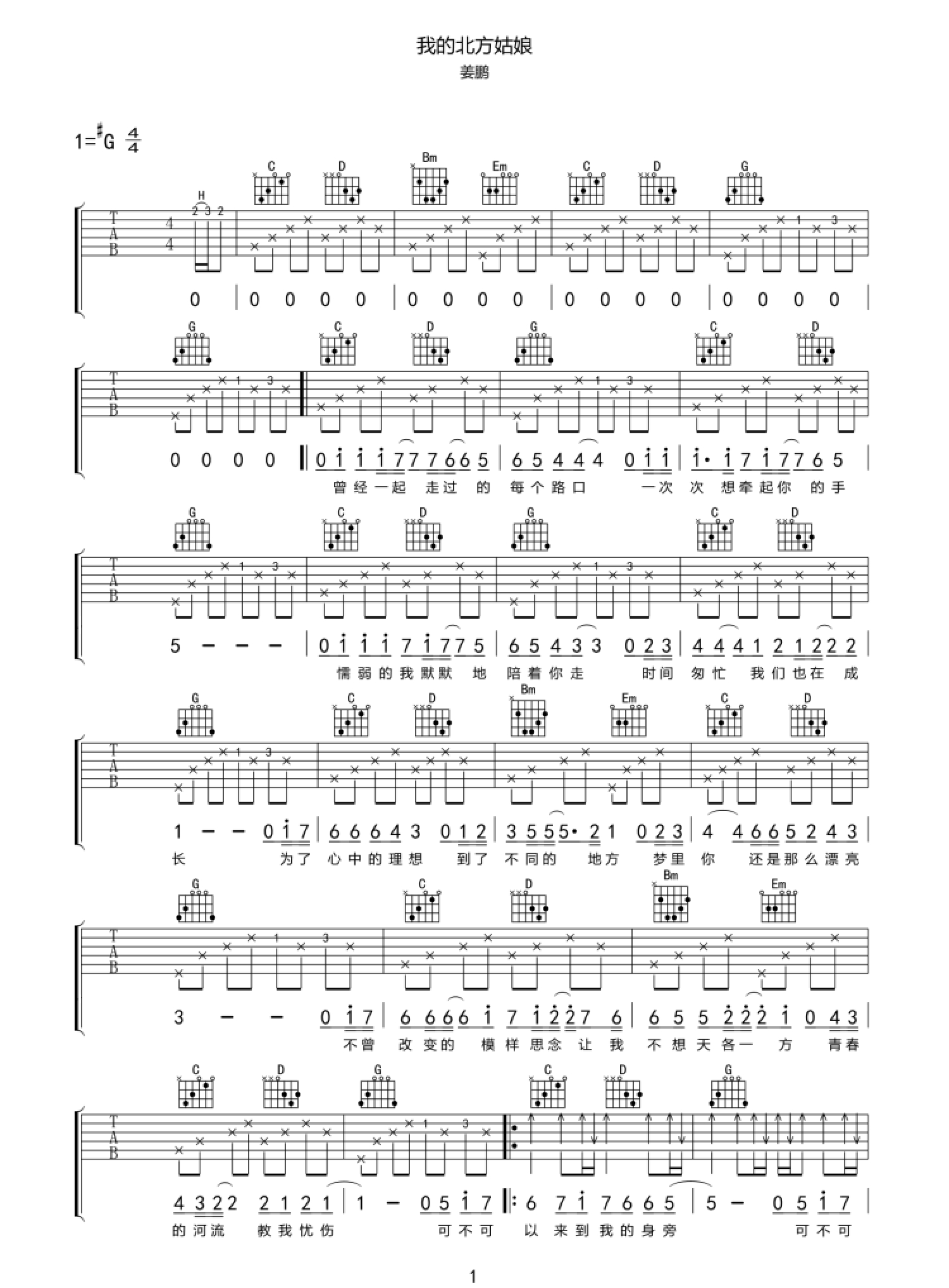 曲谱介绍: 姜鹏《我的北方姑娘》吉他谱_G调吉他弹唱谱