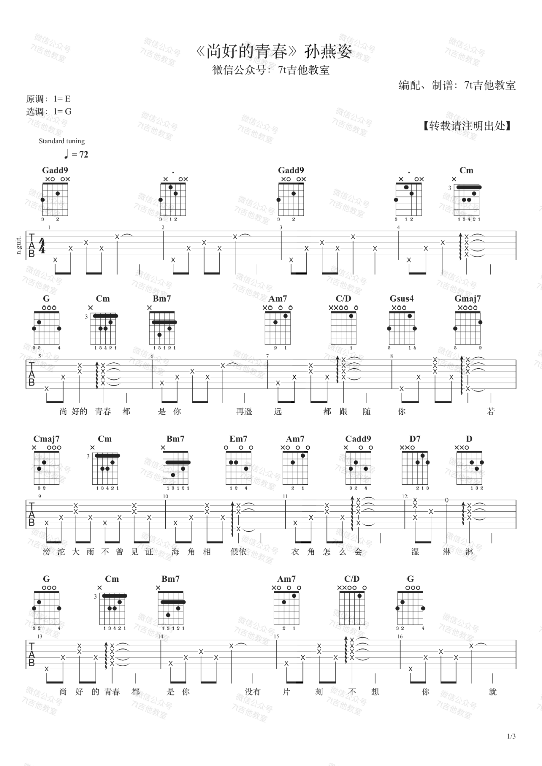 曲谱介绍: 吉他谱介绍:尚好的青春吉他谱,孙燕姿演唱的一首歌曲,4/4拍的节奏,这首歌曲的原调为E调,这里曲谱采用了G调指法进行编配,演唱时可根据个人情况选择变调夹,曲谱由琴谱网更新上传,共3张高清图片弹唱吉他谱例,来源于@7T吉他教室编配出品。这首歌没有刻意煽情的眼泪,也没有风花雪月的分离,只有情到浓时的轻叹,她独特的咬字与转音都在简单的曲调里传达出最深处的思念。