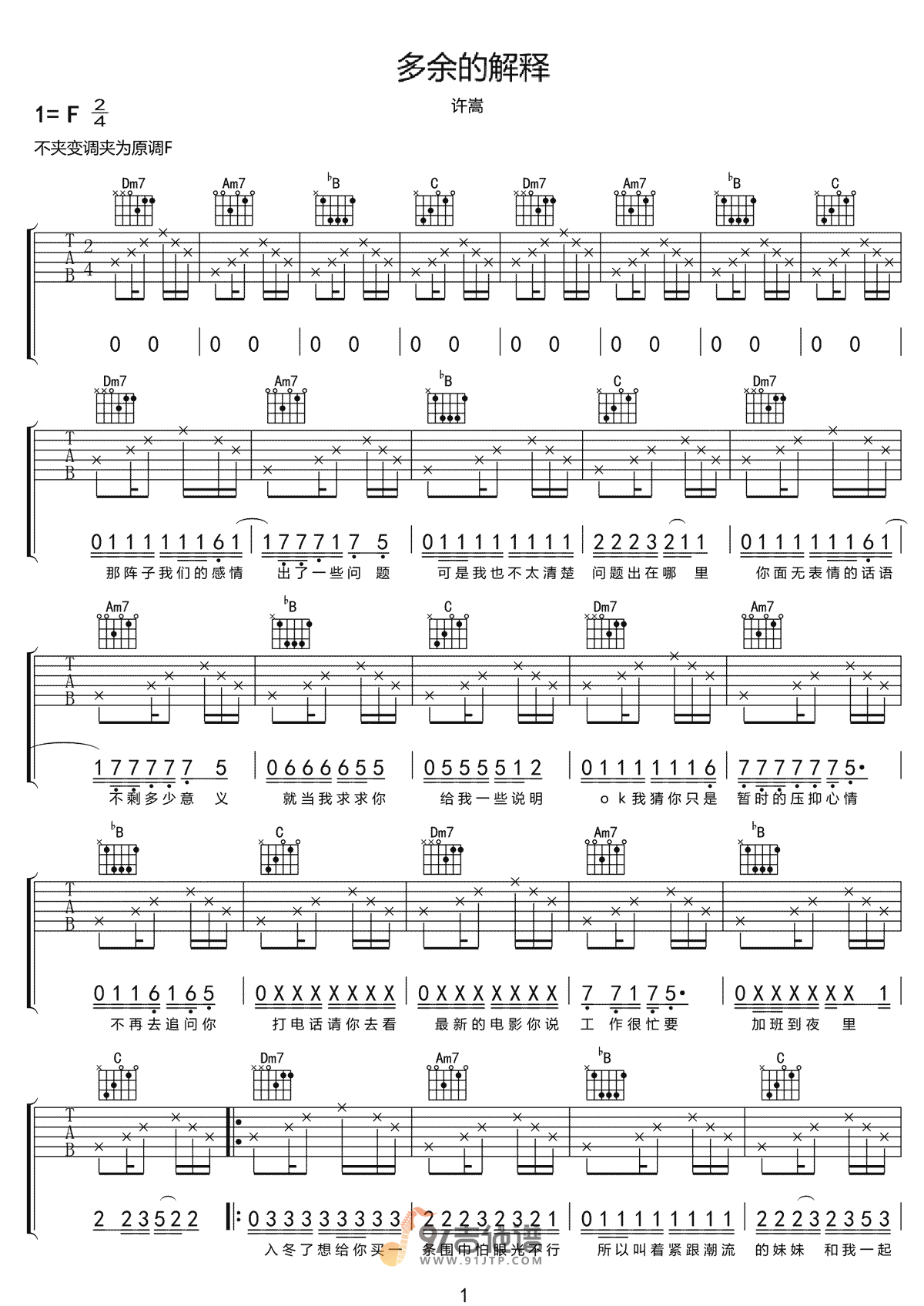 多余的解释吉他谱 - 许嵩 - F调吉他弹唱谱 - 原版