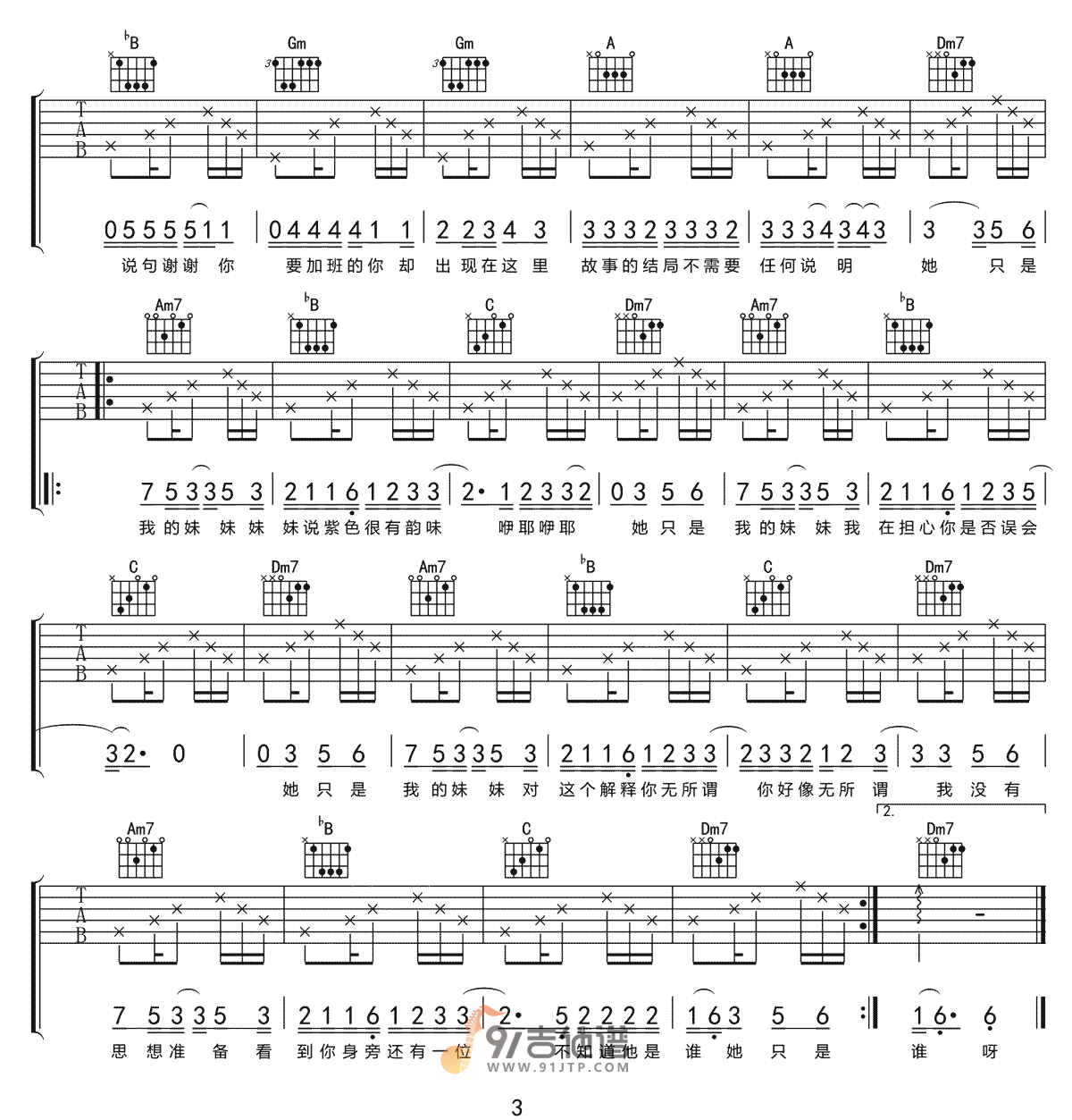 曲谱介绍: 曲谱简介:多余的解释吉他谱,许嵩演唱的一首歌曲,2/4拍的节奏,这首歌曲的原调为F调,这里曲谱采用了F调指法进行编配,演唱时可不夹变调夹,曲谱由琴谱网更新上传,共3张高清图片弹唱吉他谱例,曲谱来源于网络转载,编配制谱者暂不详。当信任出现了缺口,就再也难以愈合了吧。而在这歌中许嵩也用他独特的方式给我们展示了,由希望失望绝望的感情色彩变化。