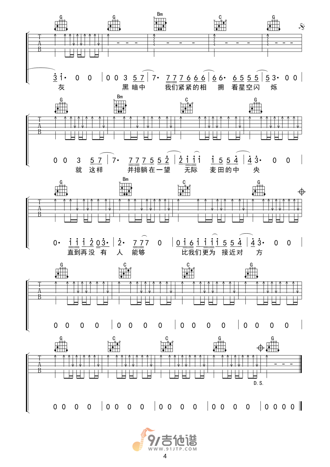 曲谱介绍: 曲谱简介:没有人能够比我们更接近对方吉他谱,声音玩具演唱的一首歌曲,4/4拍的节奏,这首歌曲的原调为B调,这里曲谱采用了G调指法进行编配,演唱时夹变调夹4品可回到原调,也可根据个人实际嗓音情况选择。曲谱由琴谱网更新上传,共4张高清图片弹唱吉他谱例,曲谱来源于网络转载,编配制谱者暂不详。这是一首诗,也是一幅画,是我们彼此间闪烁着的一种相似的光芒。我们听着对方的呼吸声入睡,新余晖射入我们透明的心脏,我们睡在麦田里,被麦浪推起又放下。