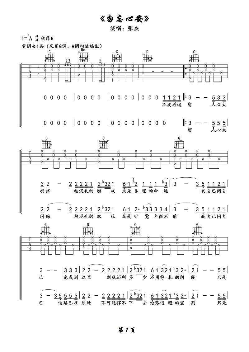 勿忘心安吉他谱 - 张杰 - G调吉他弹唱谱 - 原版