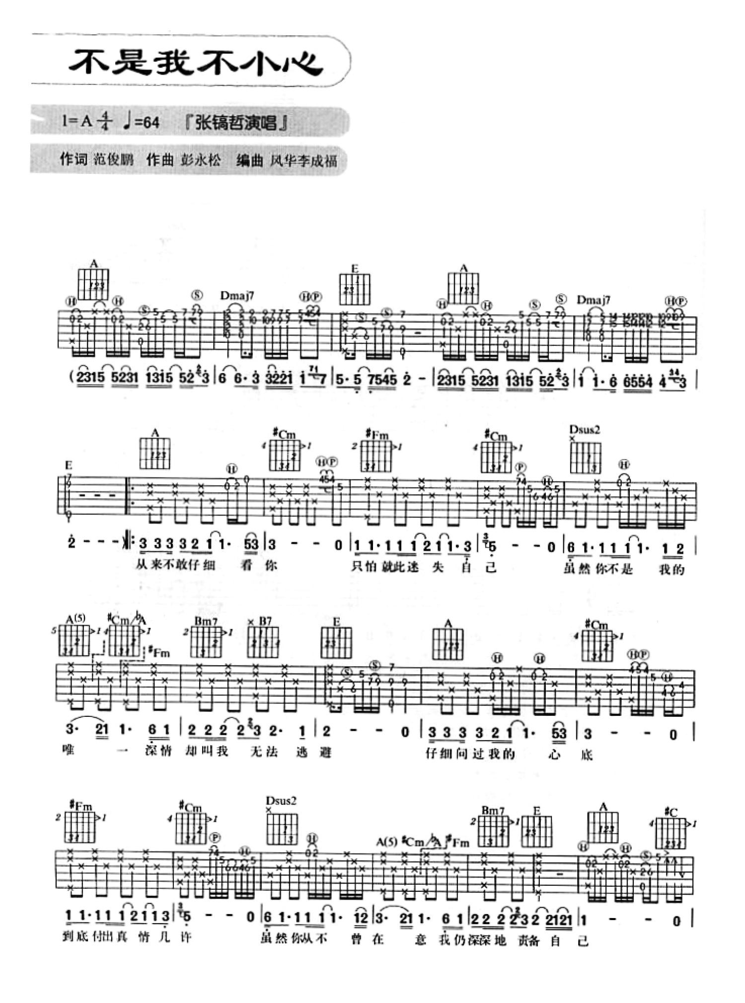 不是我不小心吉他谱 - 张镐哲 - A调吉他弹唱谱