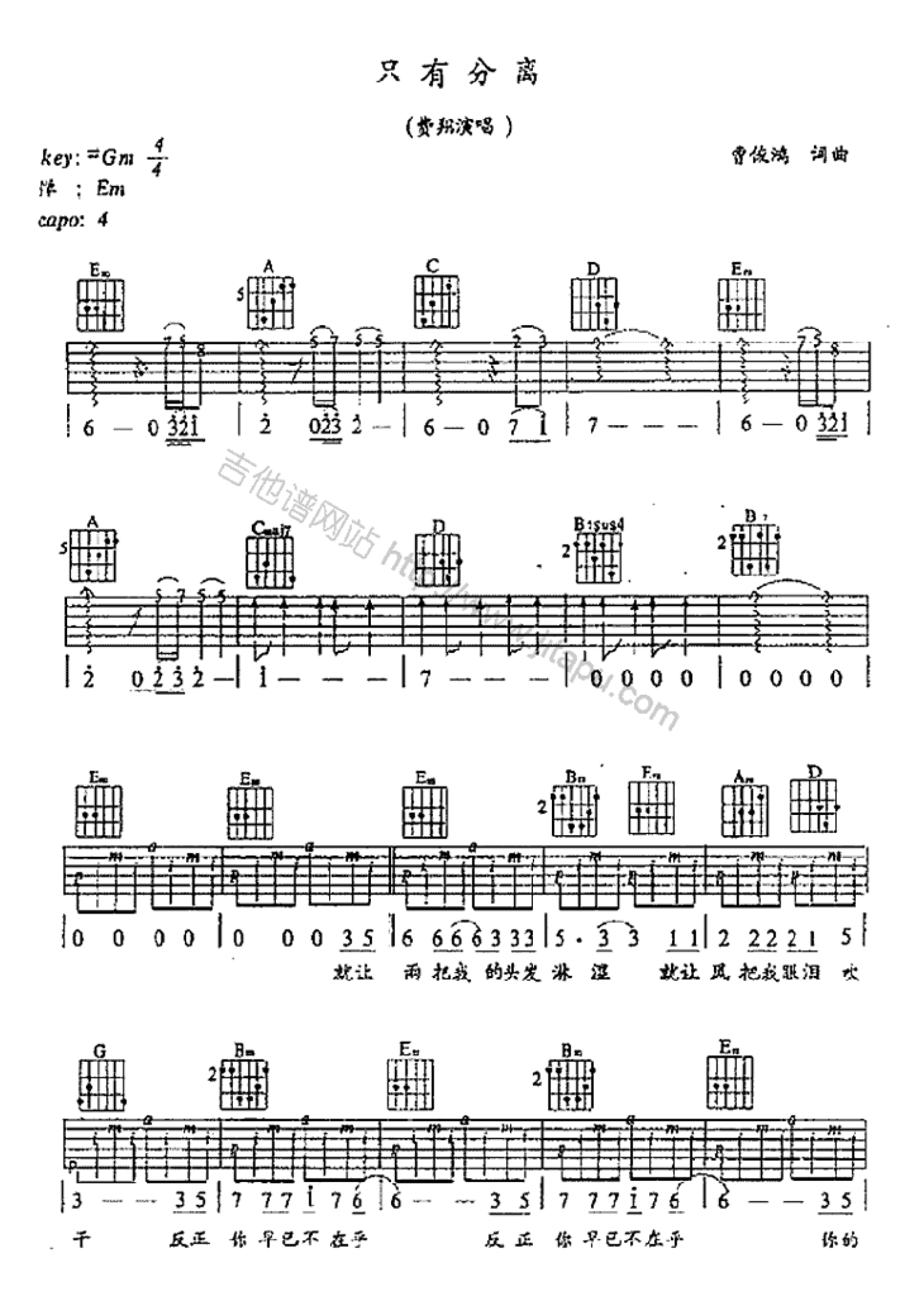 只有分离吉他谱 - 费翔 - E调吉他弹唱谱