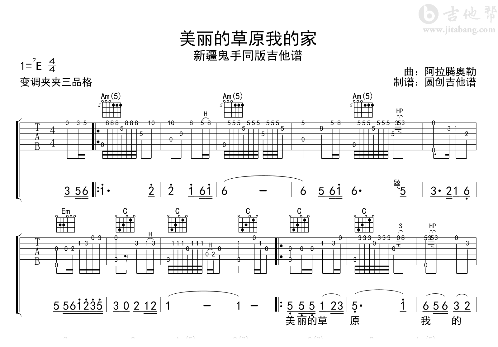 曲谱介绍: 美丽的草原我的家指弹谱,新疆鬼手同版吉他谱,一首经典的草原歌曲,《美丽的草原我的家》吉他独奏指弹谱,原调bE,变调夹夹三品格,完整版共两张高清图片谱例。随谱附上演奏示范,音频变调夹夹二品弹奏。 一曲优美动听的旋律,在历史的长河中显露出其穿透时光的魅力,仿佛上天所赐,人世间的神来之笔,天籁之音,百听不厌。