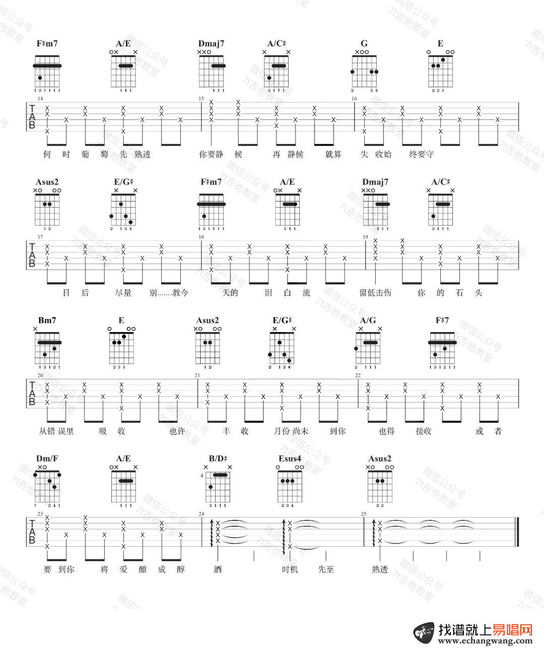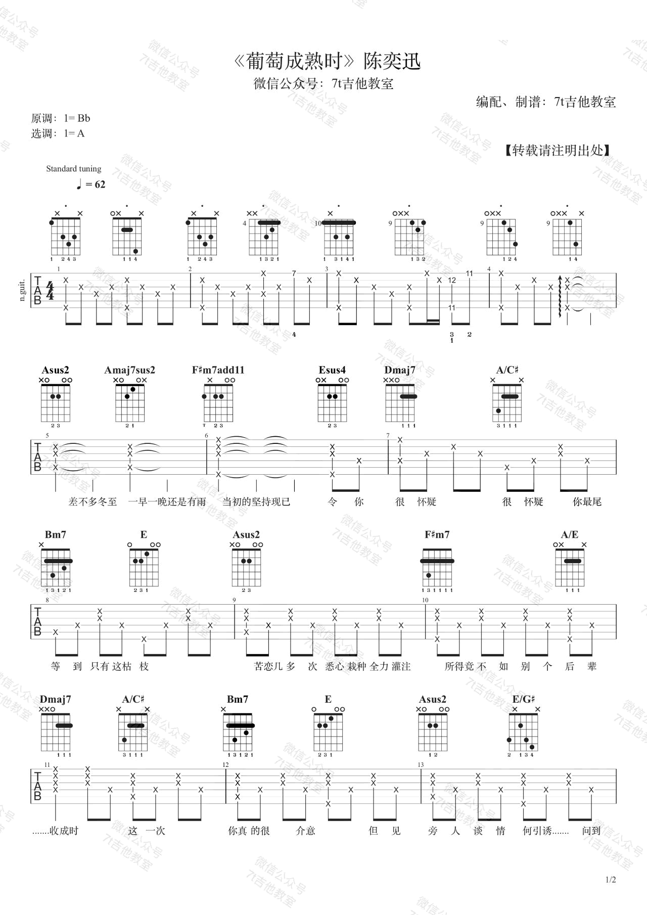 曲谱介绍: 《葡萄成熟时》吉他谱_陈奕迅_A调原版弹唱六线谱_高清图片谱分享,《葡萄成熟时》是由陈奕迅演唱的一首粤语歌曲,歌词借用对葡萄的苦心种植却收获寥寥描述出作者对人生、爱情的另一番理解与智慧。相信每个人都有错过自己喜欢的人的经历,尽心尽力的去爱一个人可最后还是分开了,就好像用心灌溉着一棵树可最后却是给别人乘凉了。Eason的歌里充满了遗憾和无奈的坚守,好像每个人的爱情都是碰到爱情时是青葡萄,但未到葡萄丰收的季节,当你用心栽培到葡萄成熟时,你却已失去丰收的权利了。