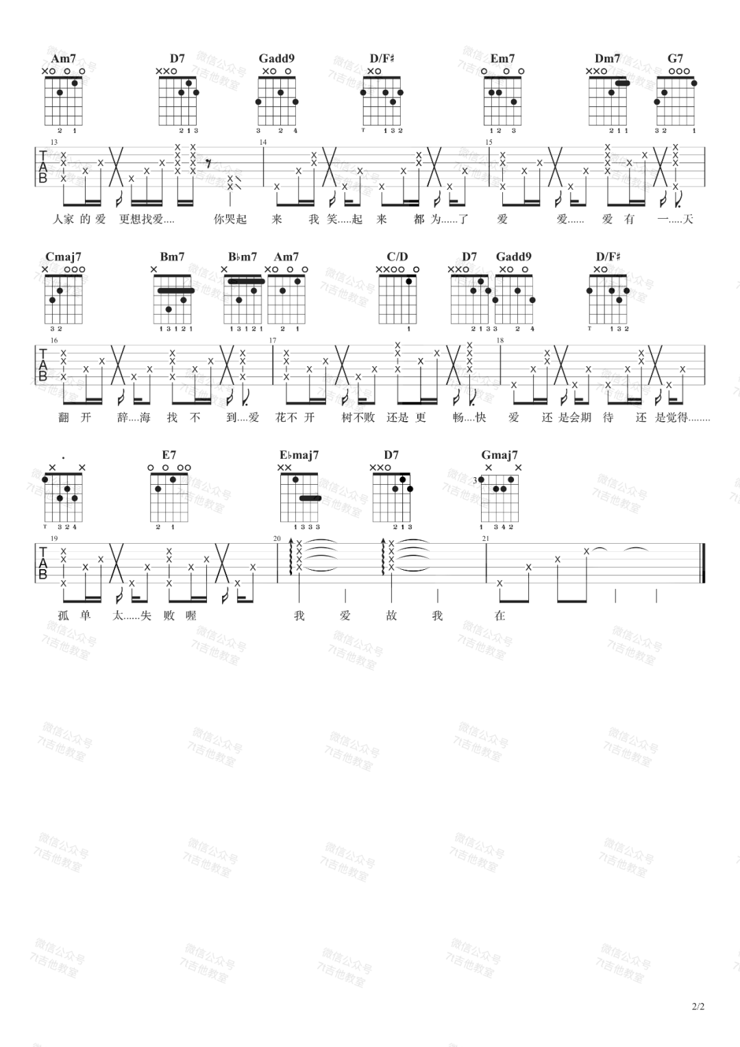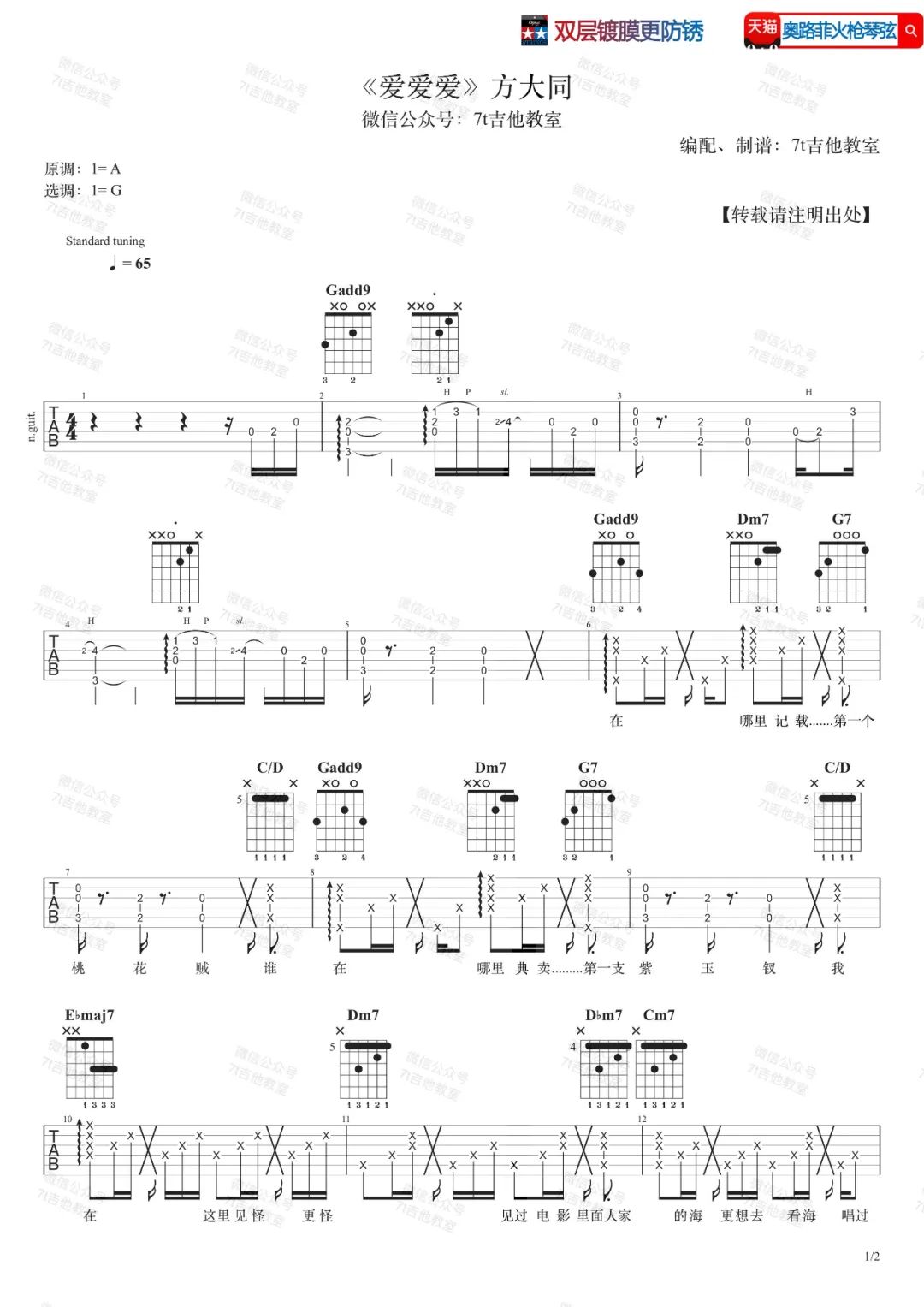 曲谱介绍: 爱爱爱吉他谱_方大同_《爱爱爱》G调弹唱谱_高清六线谱分享,《爱爱爱》是由方大同演唱的一首歌曲,这首歌这段时间热度还比较高。此版本的曲谱是来自@7T吉他教室扒谱制谱的版本,原调为A调,这里采用G调和弦进行编配,演唱时夹变调夹2品即可回到原调。这首歌的和弦编配非常丰富,这里编配把一些三和弦丰富了一下,一级用了add9,二级、三级、六级用了小七,四级用了maj7,五级用了4/5还有属七……