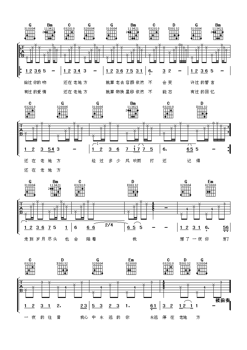 曲谱介绍: 老地方吉他谱_任贤齐_《老地方》G调弹唱六线谱_高清图片谱分享,《老地方》是任贤齐演唱的一首歌曲,由徐誉滕作词、作曲,这首歌是一首甜蜜回忆类型的歌曲,让听众回忆起一些老朋友。歌曲走的是任贤齐擅长的情歌路线,在编曲上使用大量的弦乐,还有古典吉他的solo,不复杂的编曲让任贤齐声音更能突显出来,传达出对年少恋情的丝丝不舍和感叹。另:谱上标记错误,选调为G调指法。