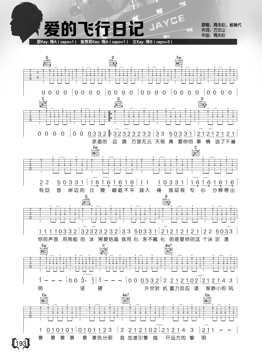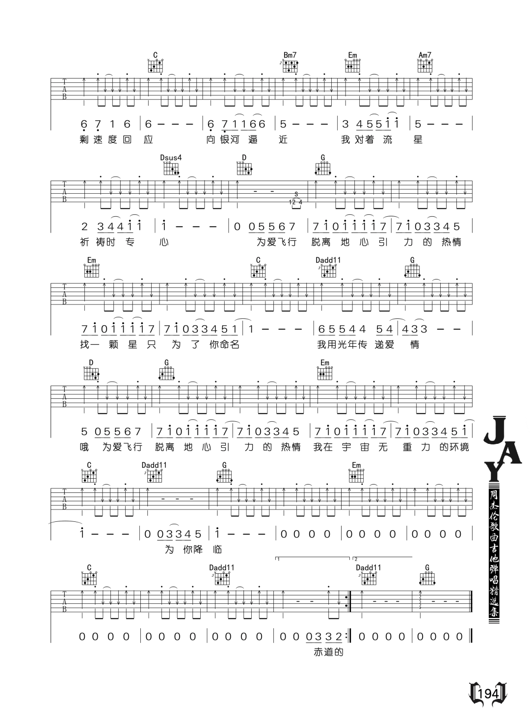 曲谱介绍: 《爱的飞行日记》吉他谱_周杰伦_G调六线谱_吉他弹唱教学分享,《爱的飞行日记》是由周杰伦作曲,并和杨瑞代一起演唱的一首歌曲。据说,周杰伦的歌迷当中,有几位是天文爱好者,他们共同发现了一颗小行星,为了表达对偶像的热爱,他们共将这颗小行星命名为“周杰伦星”,为了感谢粉丝的支持,周董也是创作了这首《爱的飞行日记》来回报粉丝,歌词中“找一颗星,就为你命名”就是这首歌的点睛之笔。