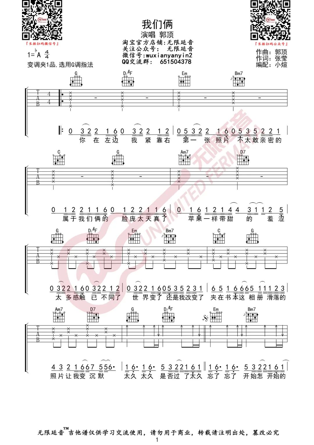 曲谱介绍: 《我们俩》吉他谱_郭顶_G调原版编配_高清弹唱六线谱分享,《我们俩》是由郭顶作曲并演唱的一首歌曲,这首歌的创作角度也如同他发行的专辑名称《微微》一样,从恋人相恋时光中的点点滴滴来描述男孩与女孩之间质朴的感情。歌曲所讲述的并不是那种如电影般戏剧化的感情故事,它就是可能发生在你我每人身上的故事的剪影。歌曲原调为降A调,这里是来自@无限延音根据原版编配的G调弹唱吉他谱,和弦及节奏型均比较简单比较容易练习。