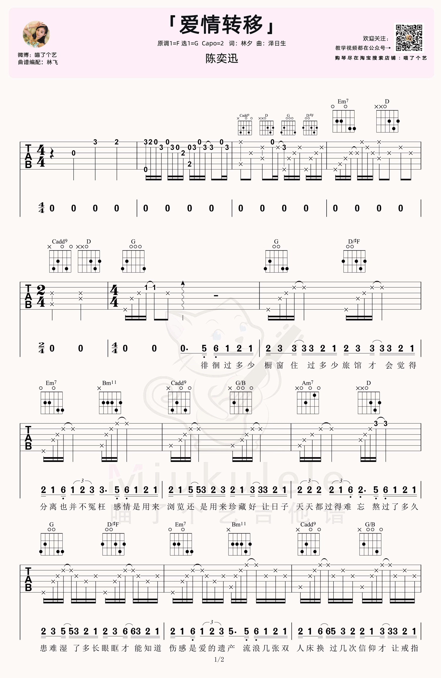 曲谱介绍: 《爱情转移》吉他谱_陈奕迅_G调原版六线谱_吉他弹唱教学分享,《爱情转移》是由陈奕迅演唱的一首歌曲,也是电影《爱情呼叫转移》的主题曲。歌曲旋律感人至深,配上词人林夕富有生活哲理的歌词,再加上Eason深沉而又极富感染力的声音,以及整支MV恰如其分的意境表现,是一首值得观众欣赏的歌曲。歌词第一部分讲的是分开之后的回味和毁伤,第二部分是讲同床异梦的惆怅,副歌部分讲的就是正确反省后对爱情所应该拥有的正确态度。