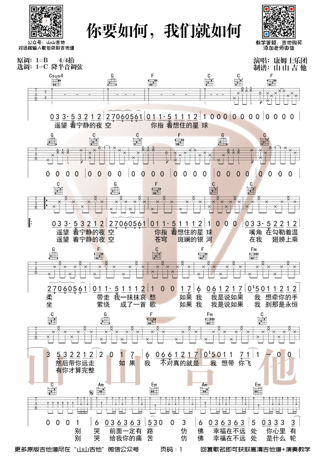 曲谱介绍: 《你要如何我们就如何》吉他谱_康姆士乐团_G调弹唱六线谱分享,《你要如何我们就如何》是由康姆士乐团演唱的一首歌,这首歌也是特别治愈的一首作品,配合主唱可爱的台普发音,隐约中会给你一种亲近感。这首歌的创作初衷也很动人:主唱永驻以前去过东南亚一个污染严重的贫困小村子,那里的孩子们都很向往外面的生活,想赚很多钱,但同时又不想离开村子和家人。永驻便为他们写下了“遥望着宁静的夜空,你指着想住的星球”这句歌词,很温暖。