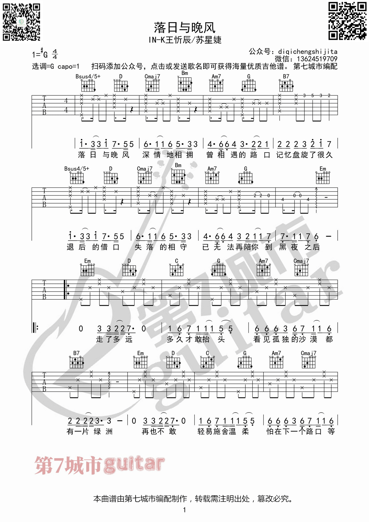 落日与晚风吉他谱 - 王忻辰/苏星婕 - G调吉他弹唱谱