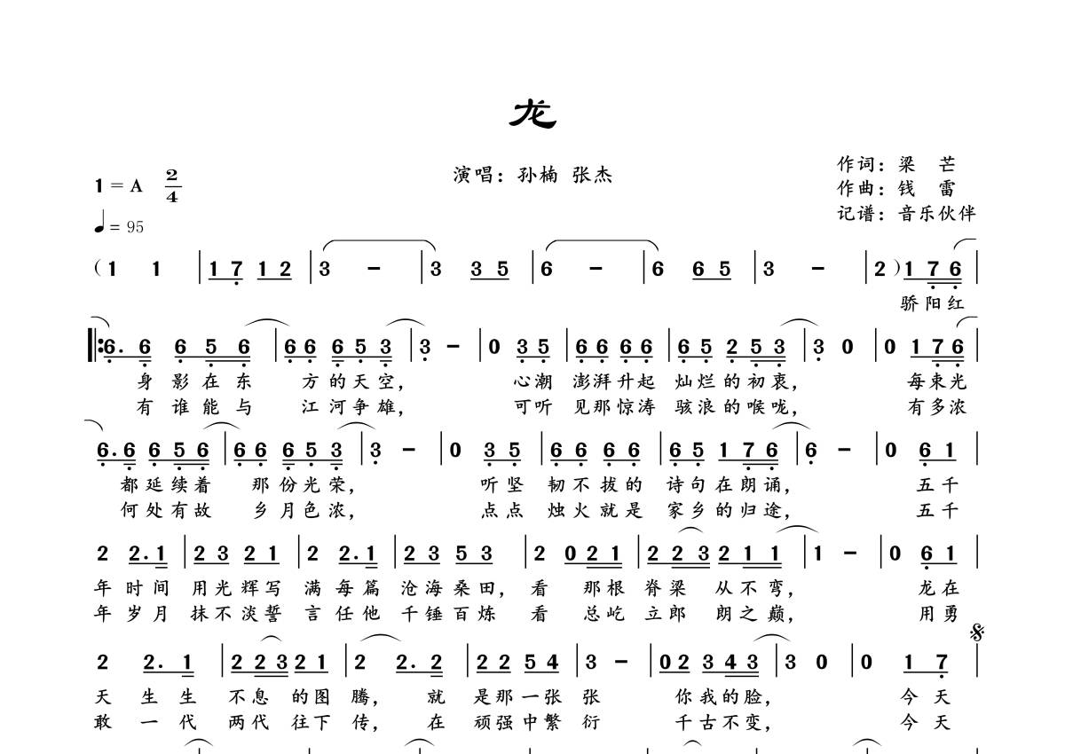 曲谱介绍: 孙楠/张杰《龙》,音乐伙伴编配出品,共有1张高清图谱,免翻页排版设计。