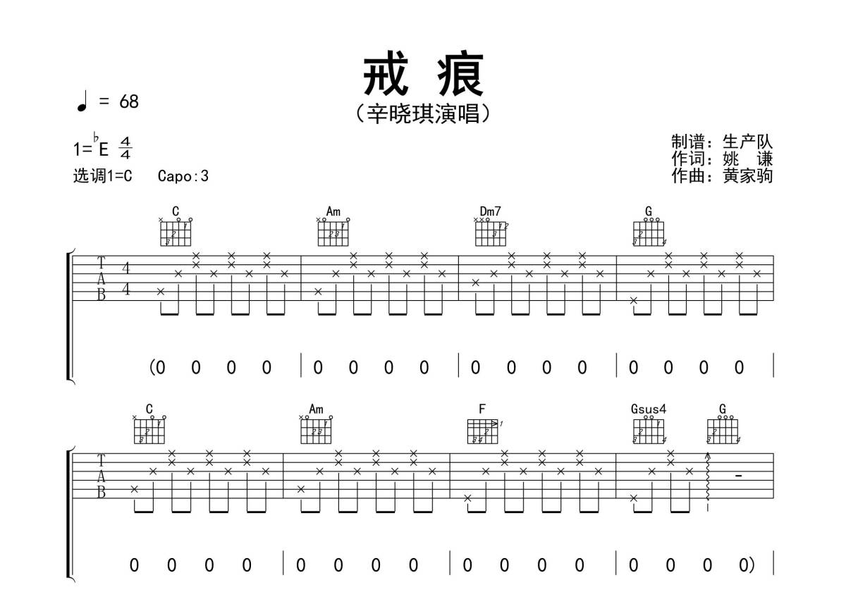曲谱介绍: 辛晓琪《戒痕》吉他弹唱谱,采用C调指法编配精编民谣版,生产队编配出品,共有3张高清图谱。