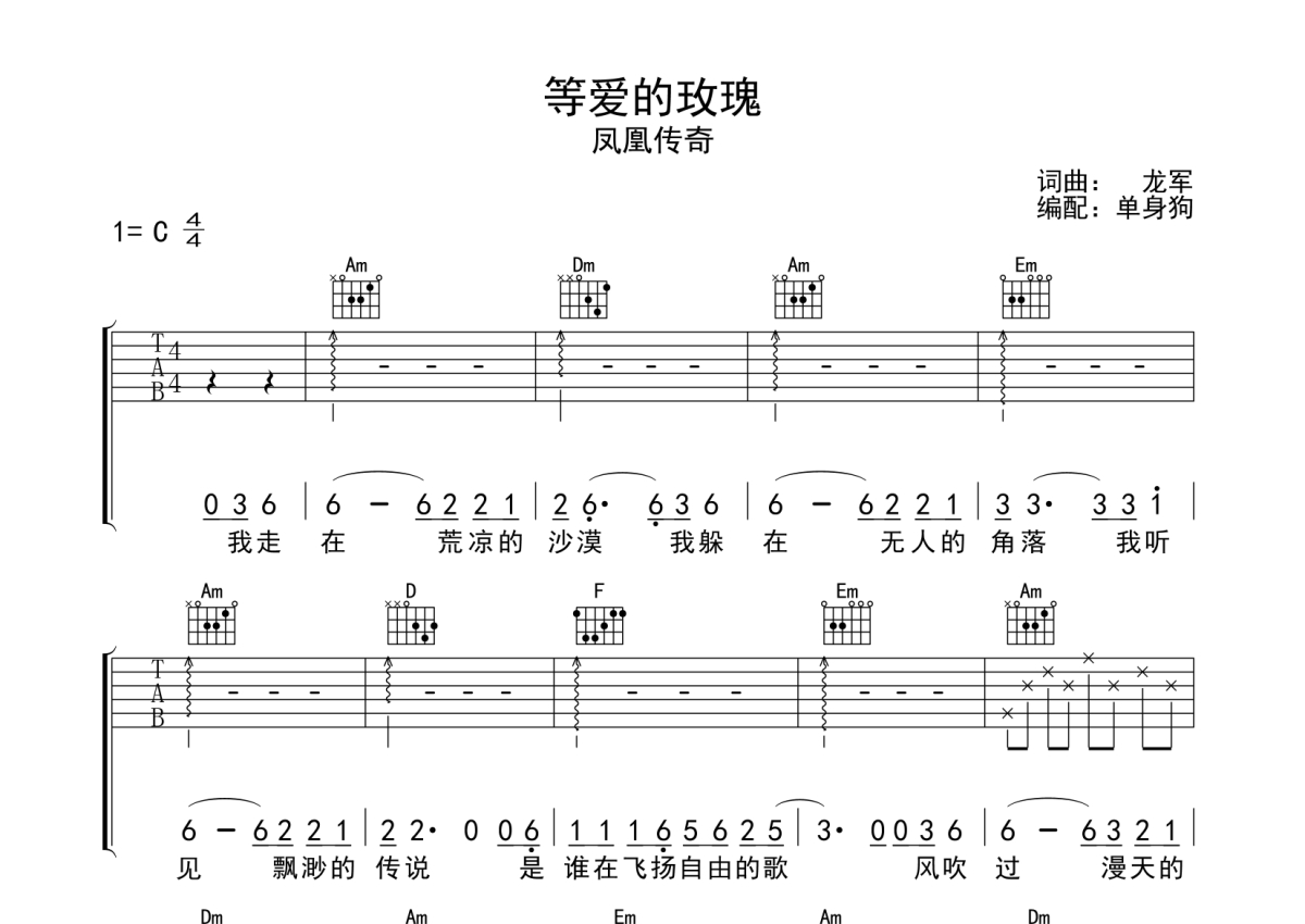 曲谱介绍: 凤凰传奇《等爱的玫瑰》吉他弹唱谱,采用C调指法编配,单身狗编配出品,共有6张高清图谱。