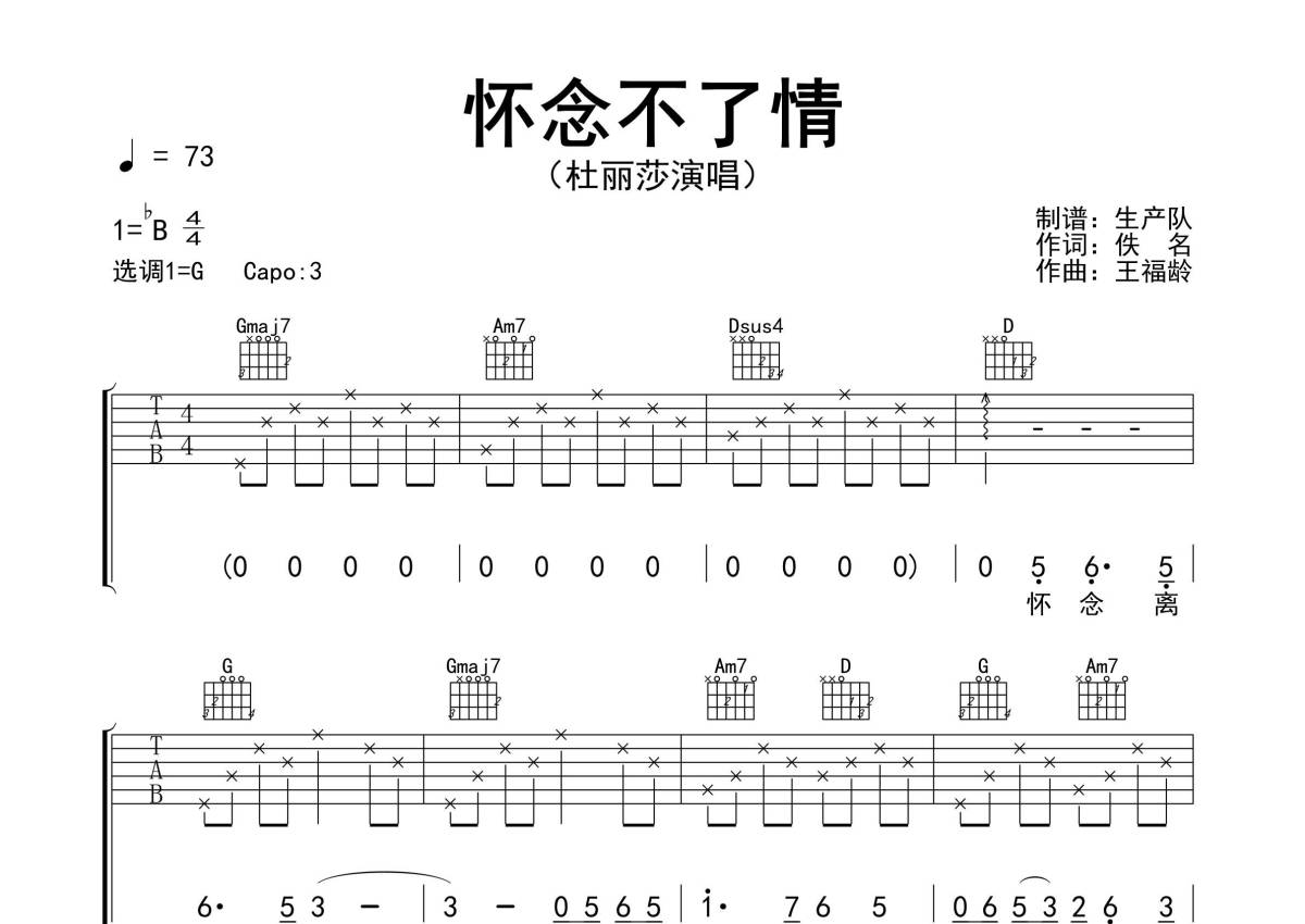 曲谱介绍: 杜丽莎《怀念不了情》吉他弹唱谱,采用G调指法编配精编完美版,生产队编配出品,共有3张高清图谱。