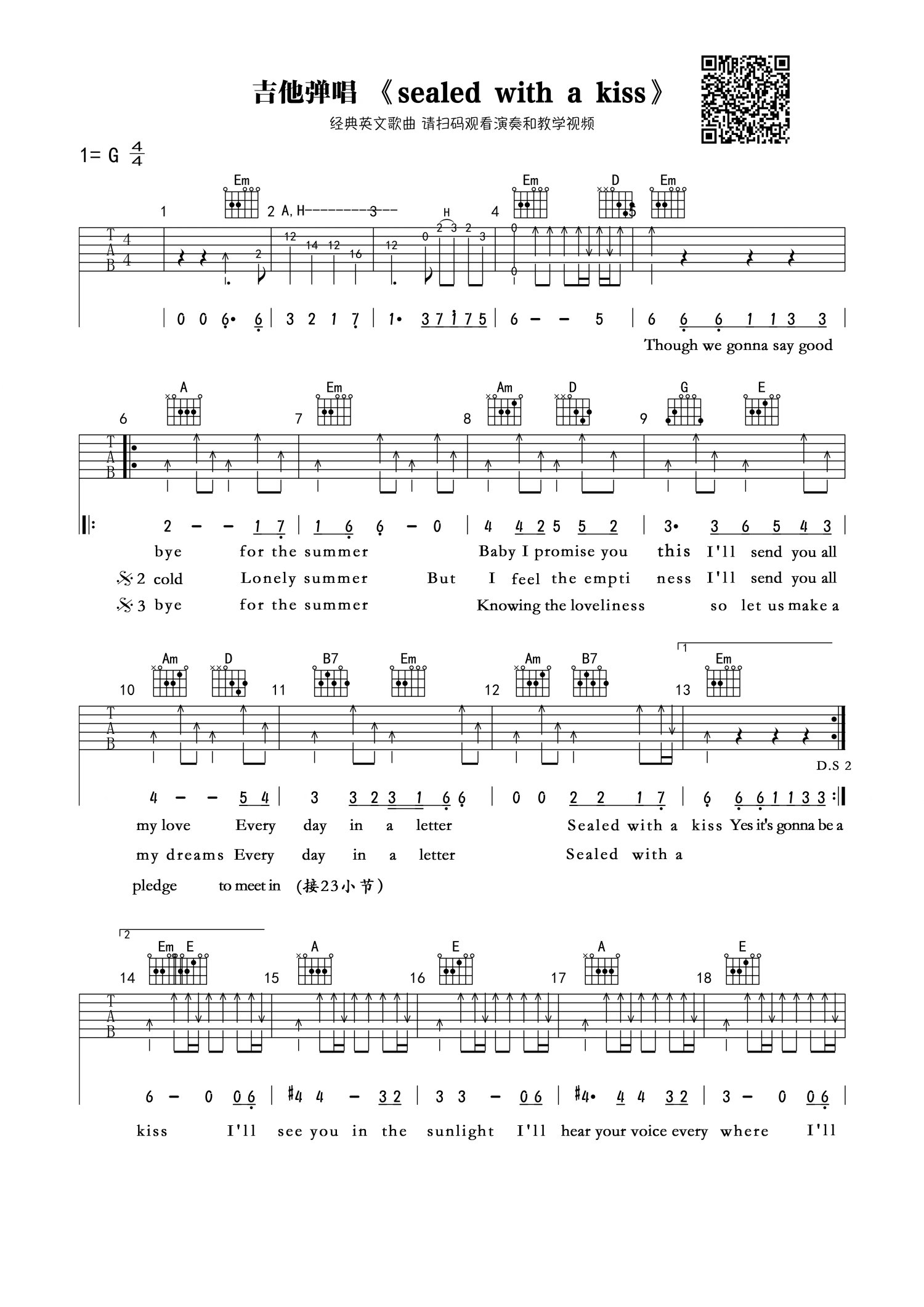 曲谱介绍: Sealedwithakiss吉他谱,一首不朽的英文歌曲,以吻封缄六线谱高清版,BrianHyland演唱,《sealedwithakiss》吉他弹唱谱。美国电影《蝴蝶梦》主题曲,经典浪漫色彩的老歌,叙离别情,但不伤感;道分手苦,但不低沉。饱尝相思之苦的恋人们听来,肯定别有一番滋味。