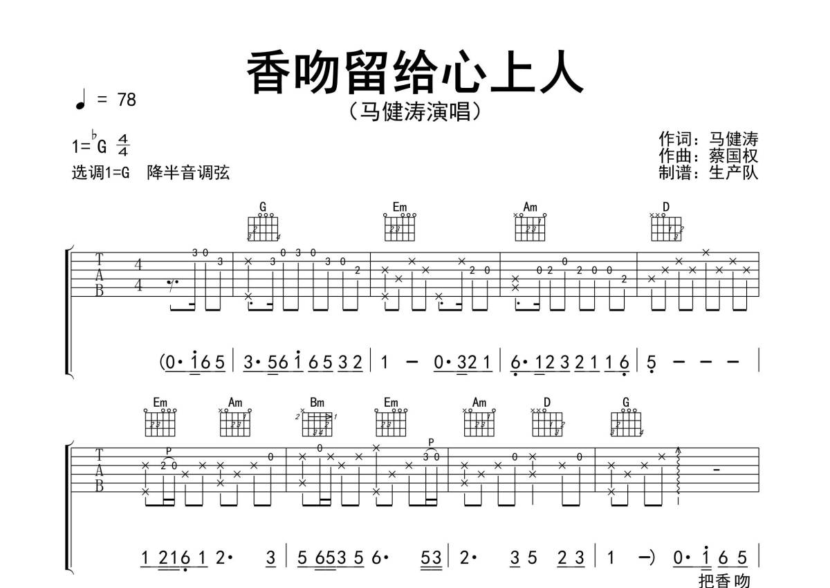 香吻留给心上人吉他谱 - 马健涛 - G调吉他弹唱谱 - 精编完美版