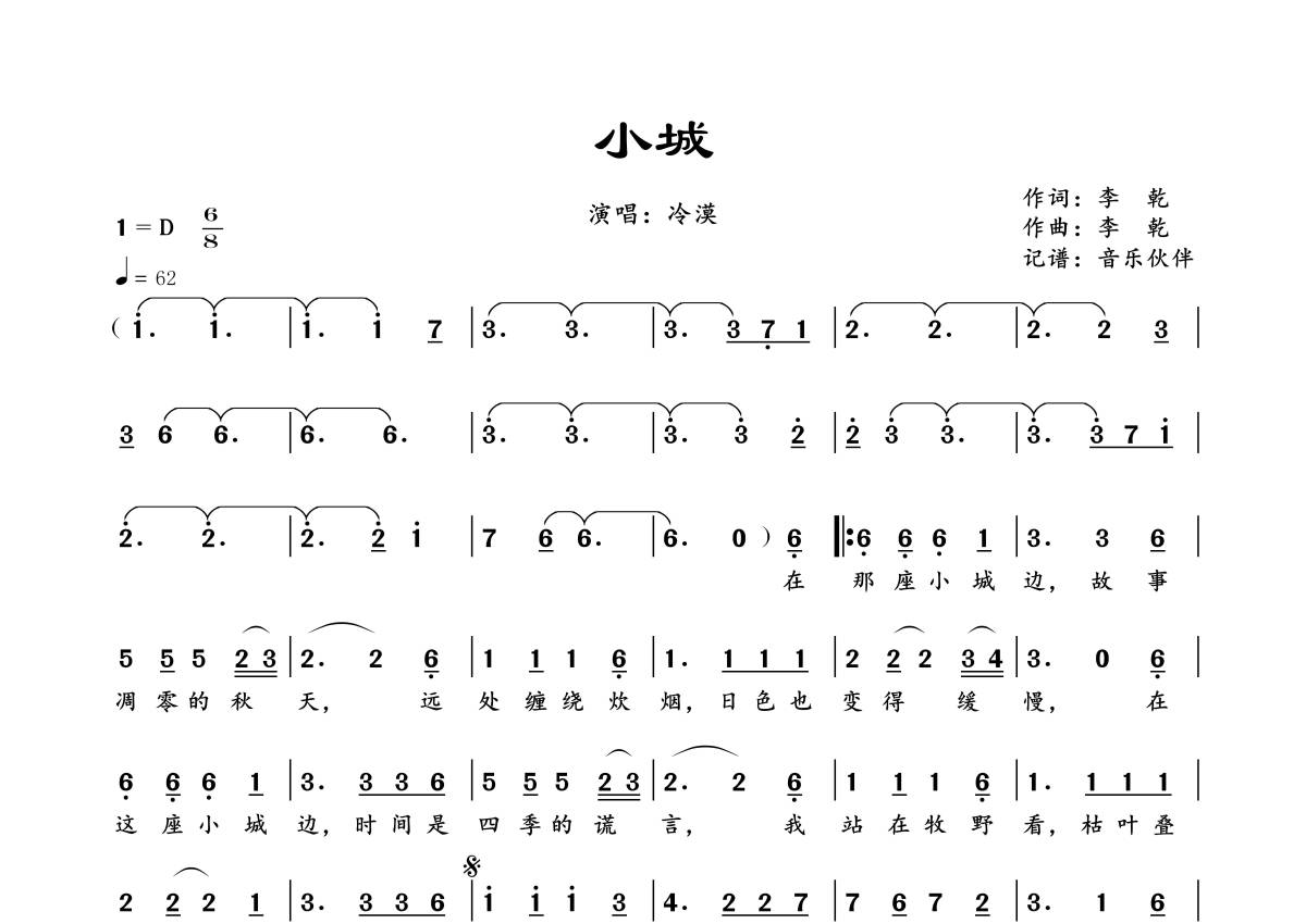 曲谱介绍: 冷漠《小城》,音乐伙伴编配出品,共有1张高清图谱,免翻页排版设计。