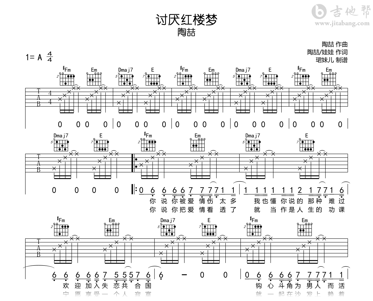 讨厌红楼梦吉他谱 - 陶喆 - A调吉他弹唱谱