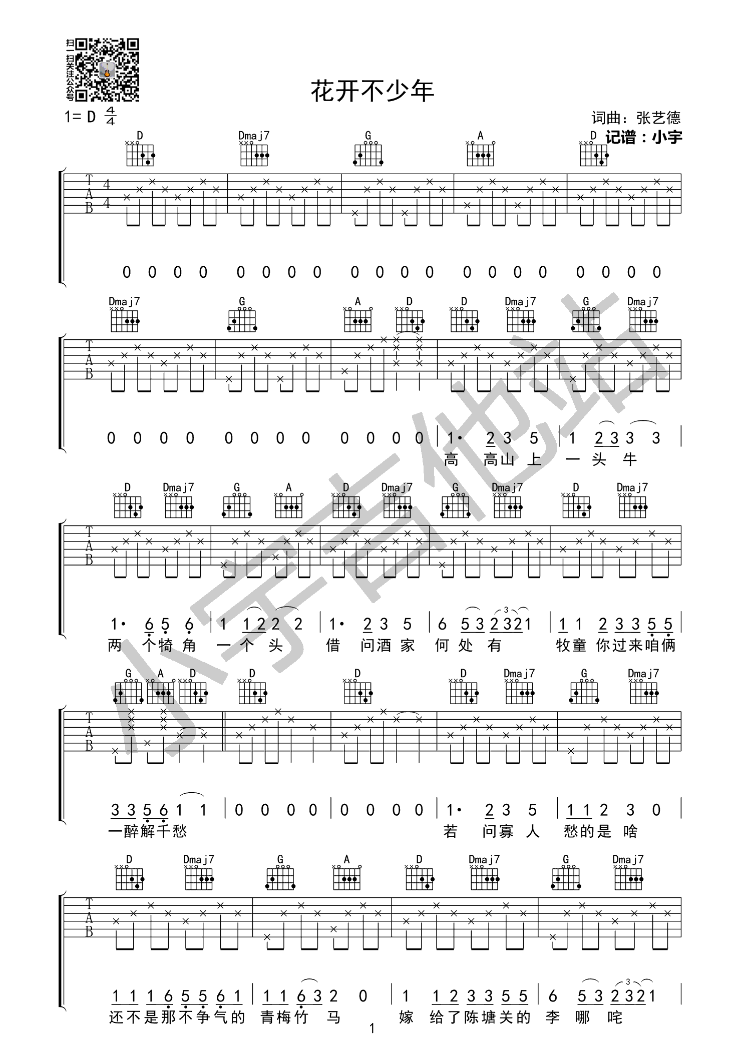 曲谱介绍: 《花开不少年》吉他谱_张艺德_D调弹唱六线谱_高清图片谱分享,《花开不少年》是由张艺德创作并演唱的一首民谣歌曲,花有重开日,人无再少年,这是一首有趣的魔性歌谣,听的人无力抵抗。高高山上一头牛,两个犄角一个头,借问酒家何处有,牧童你过来咱俩一醉解千愁,若问寡人愁的是啥,还不是那不争气的青梅竹马,嫁给了陈塘关的李哪咤,只恨我当初没有早拿下。