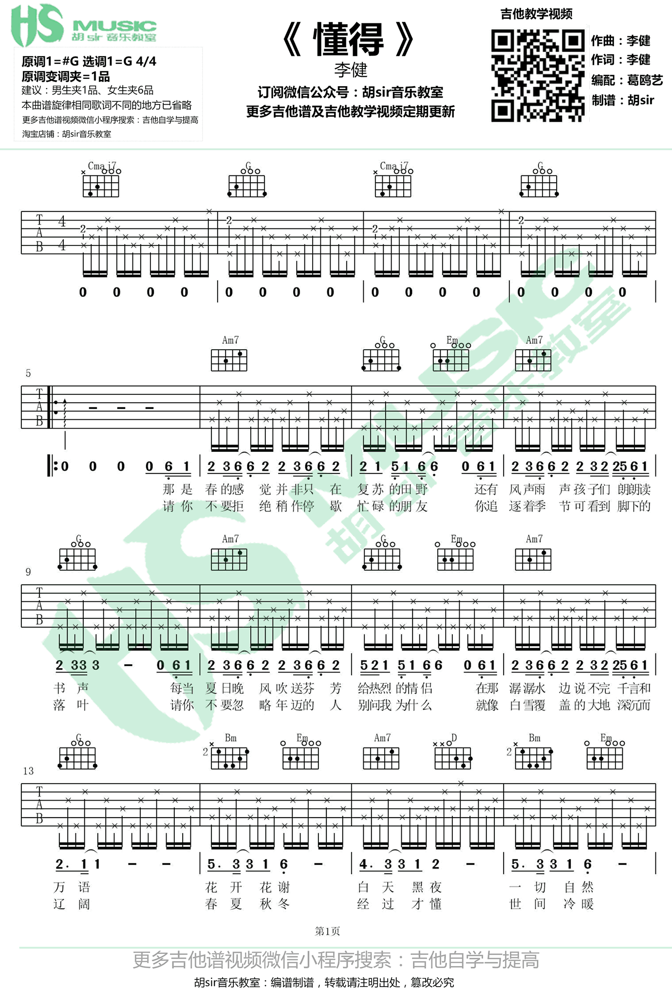 曲谱介绍: 懂得吉他谱_李健_《懂得》G调弹唱六线谱_高清图片谱分享,《懂得》是由李健作词作曲并演唱的一首歌曲,歌曲以四季更迭比喻人生百态,温暖沉静却蕴藏内心的美好与力量:有不失初心的纯粹,亦有“懂得”世间冷暖后的善意、辽阔与关怀。春夏秋冬,经过才懂!当我们懂得了很多的时候,我们才能说得上学会了生活。