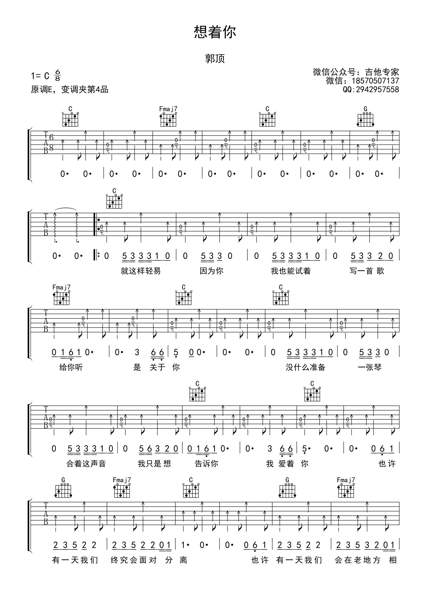 • 想着你吉他谱 - 郭顶 - C调吉他弹唱谱第1张