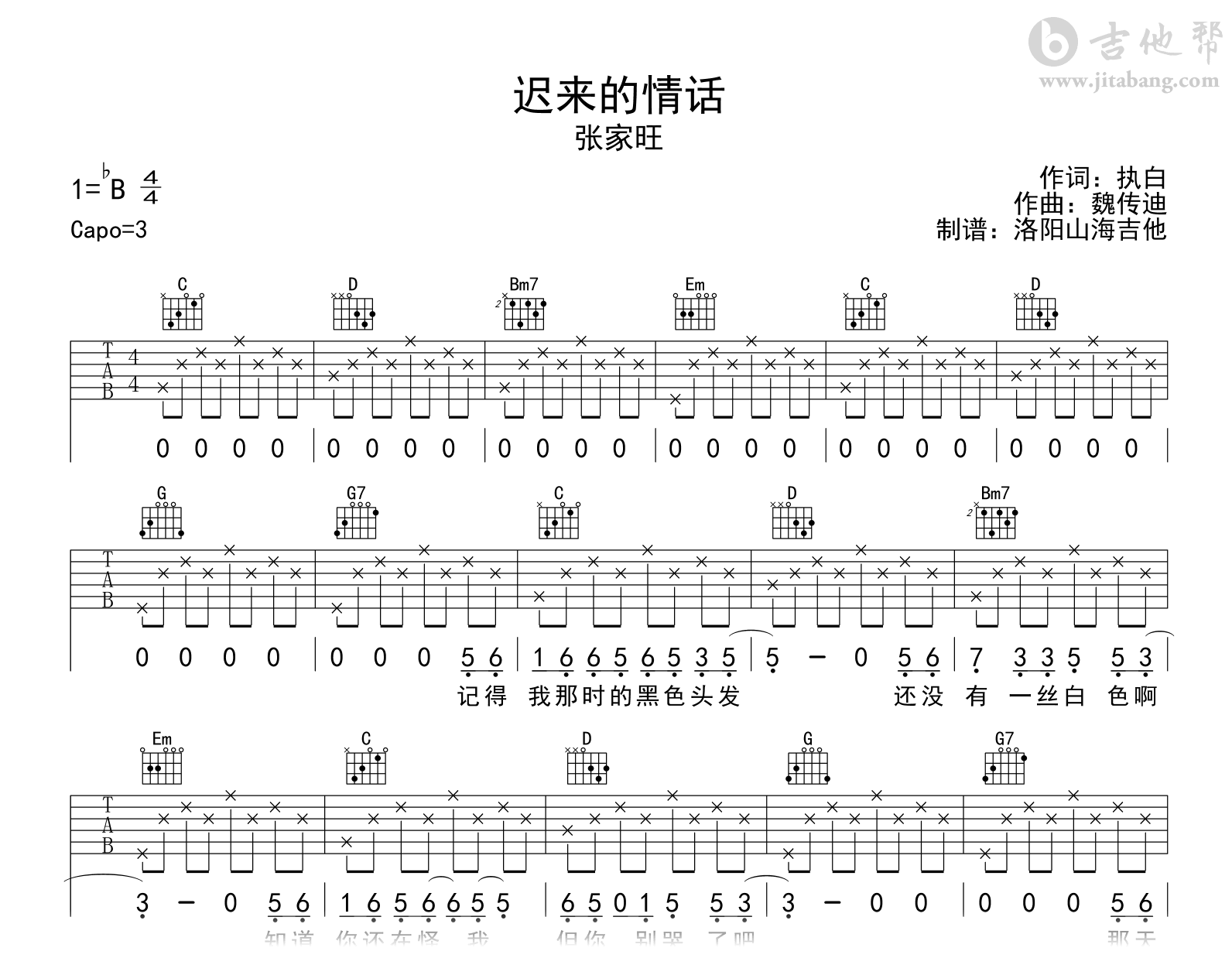 迟来的情话吉他谱 - 张家旺 - G调吉他弹唱谱