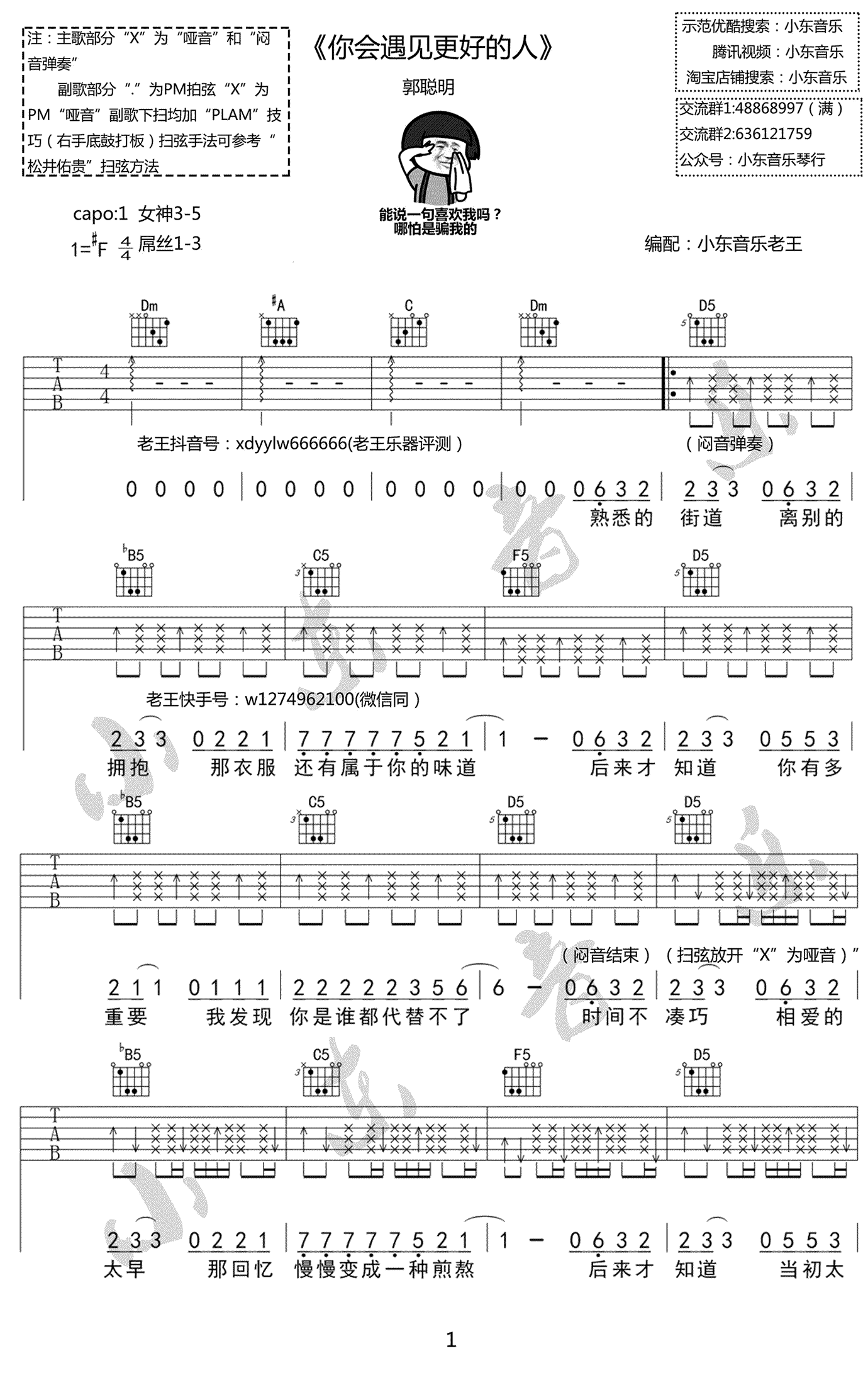 曲谱介绍: 《你会遇见更好的人》吉他谱_郭聪明_F调弹唱六线谱_高清图片谱分享,《你会遇见更好的人》是由郭聪明演唱的一首歌。