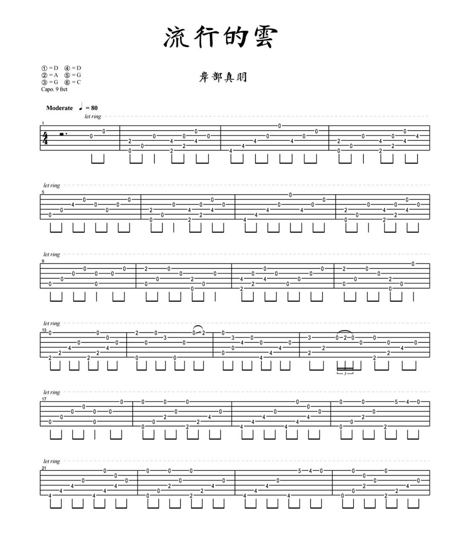 曲谱介绍: 岸部真明《流行的云》吉他谱,Capo9品,流行的云指弹谱,六线谱高清版本,三张图片谱。岸部真明用吉他创作的名曲,动听且简单,云缓缓地走,时光慢慢地流过。醒来后发现一切都过去了,但是忘不了的还是生活中的点点滴滴,犹如这首曲子的优美旋律。