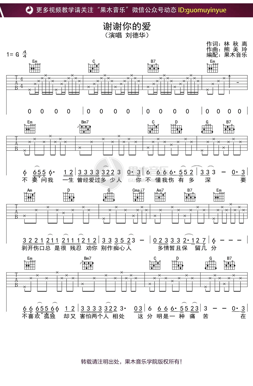 曲谱介绍: 《谢谢你的爱》吉他谱_刘德华_G调弹唱六线谱_高清图片谱分享,《谢谢你的爱》是由刘德华演唱的一首歌曲,那熟悉的旋律一响起,歌迷都跟着唱起了“不要问我,一生曾经爱过多少人。”刘德华的老歌有着相当大的感染力,都勾起歌迷们略带些怀旧的回忆。歌词中“不喜欢孤独,却又害怕两个人相处,这分明是一种痛苦”,展示了文明社会红尘男女的复杂心境。