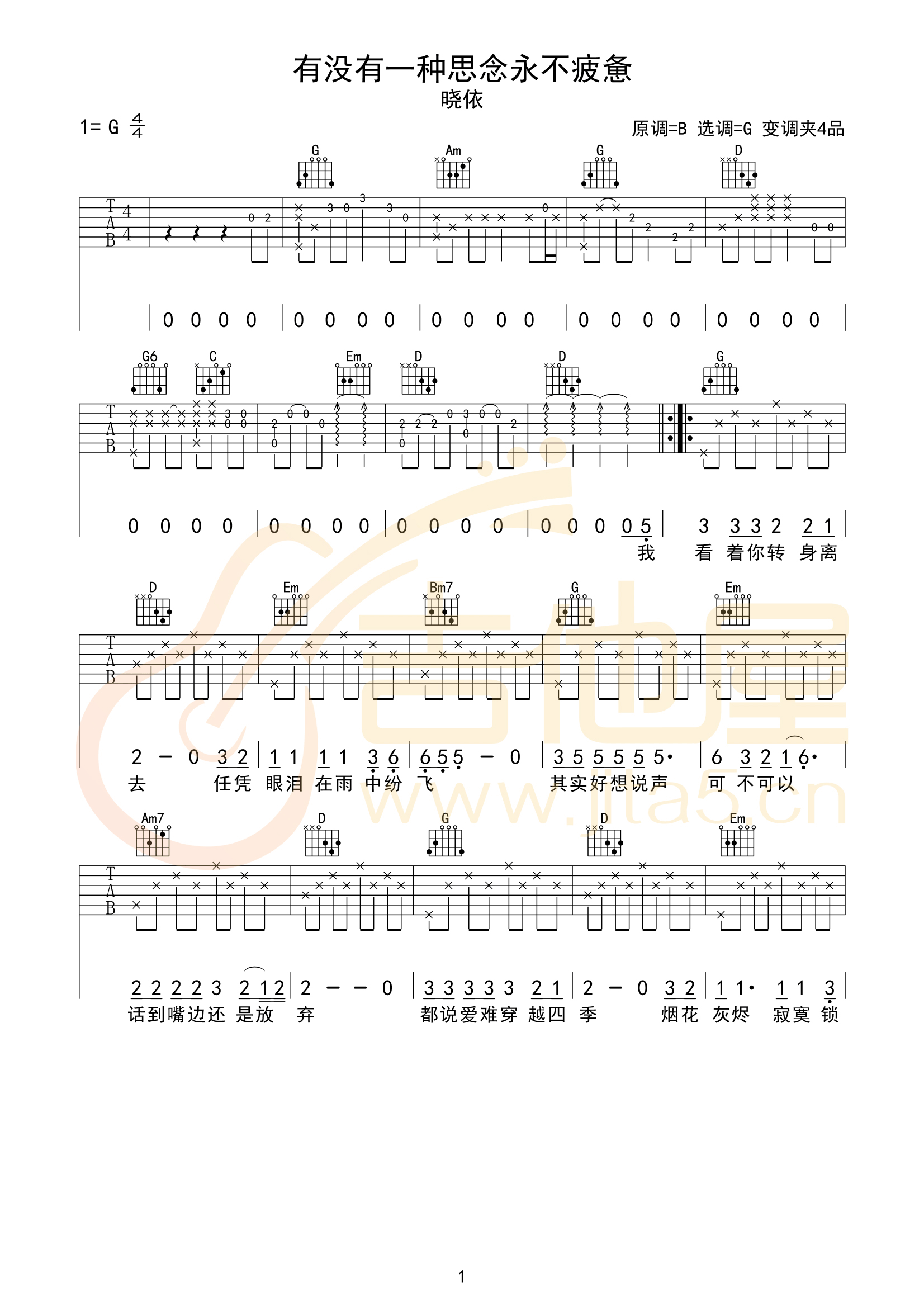 曲谱介绍: 《有没有一种思念永不疲惫》吉他谱_晓依_G调原版高清弹唱六线谱分享,《有没有一种思念永不疲惫》是由月剪西风作词作曲,歌手晓依演唱的单曲。
