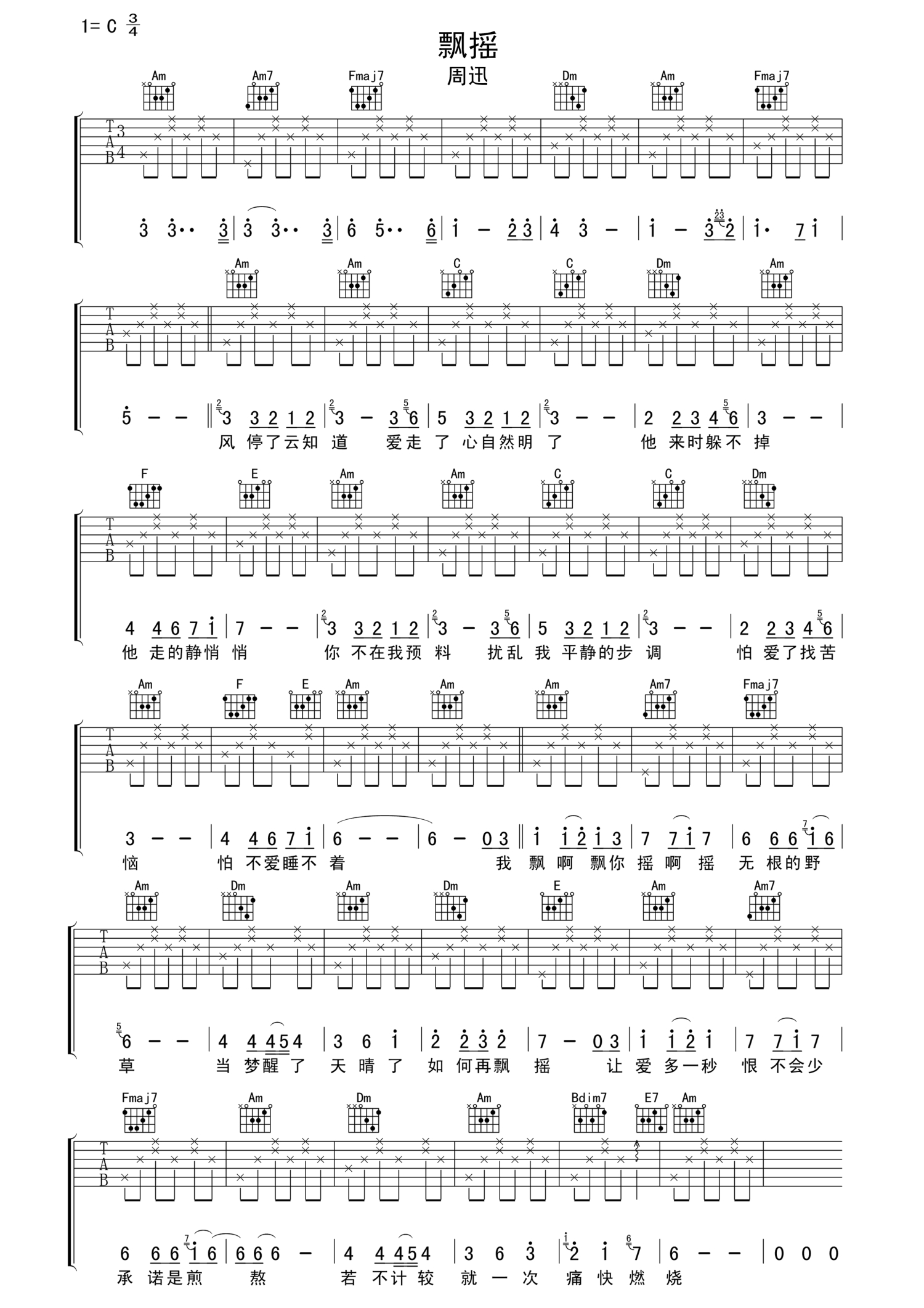 曲谱介绍: 周迅飘摇六线谱下载由打谱啦网站提供,吉他曲谱选调C调,您可参考本和弦示意图和扫弦指法进行吉他弹奏。当那淡淡的曲调在你的耳边响起时,不知你有没有一种想要"飘摇"的冲动.这首歌曲地给我们讲述了一个爱情故事. 飘摇歌词  作词:易家扬,作曲:陈耀川 演唱:周迅 风停了云知道,爱走了心自然明了,他来时躲不掉,他走的静悄悄,你不在我预料,扰乱我平静的步调,怕爱了找苦恼,怕不爱睡不着。你不在我预料,扰乱我平静的步调,怕爱了找苦恼,怕不爱睡不着,我飘啊飘你摇啊摇,无根的野草,当梦醒了天晴了,如何在飘渺,啊爱多一秒恨不会少,承诺是煎熬,若不计较就一次痛快燃烧。