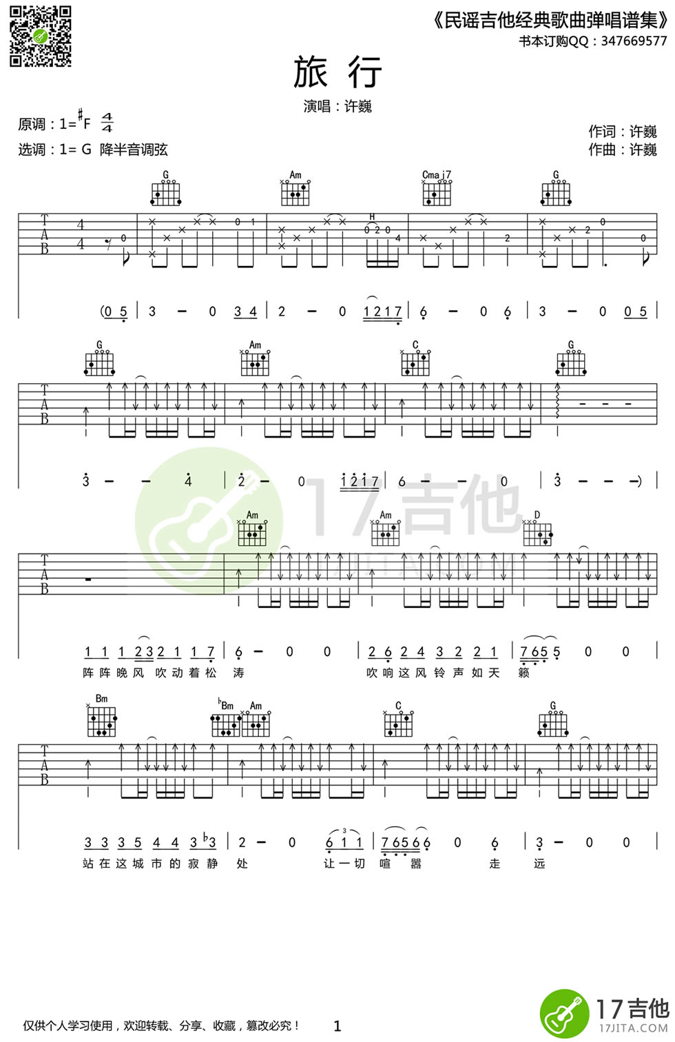 曲谱介绍: 旅行吉他谱_许巍_《旅行》G调简单版弹唱六线谱_高清图片谱分享,《旅行》是由许巍作词、作曲并演唱的一首歌曲,这首歌也是作为了电影《后会无期》的插曲之一。这首歌是在词曲、编曲、意境各方面极为和谐的一首歌,它有着入世的深情况味,也有着出世的随缘自在。曲中那些简单的意象,松涛、风铃、蝴蝶、晚霞,犹如随手拈来的缤纷花朵,在副歌中自然流露的儿童的天真与长者的睿智中形成水乳交融般的完美和谐。人生是漫长的旅行,青山绿水美景如画都是我们旅程中的一站。