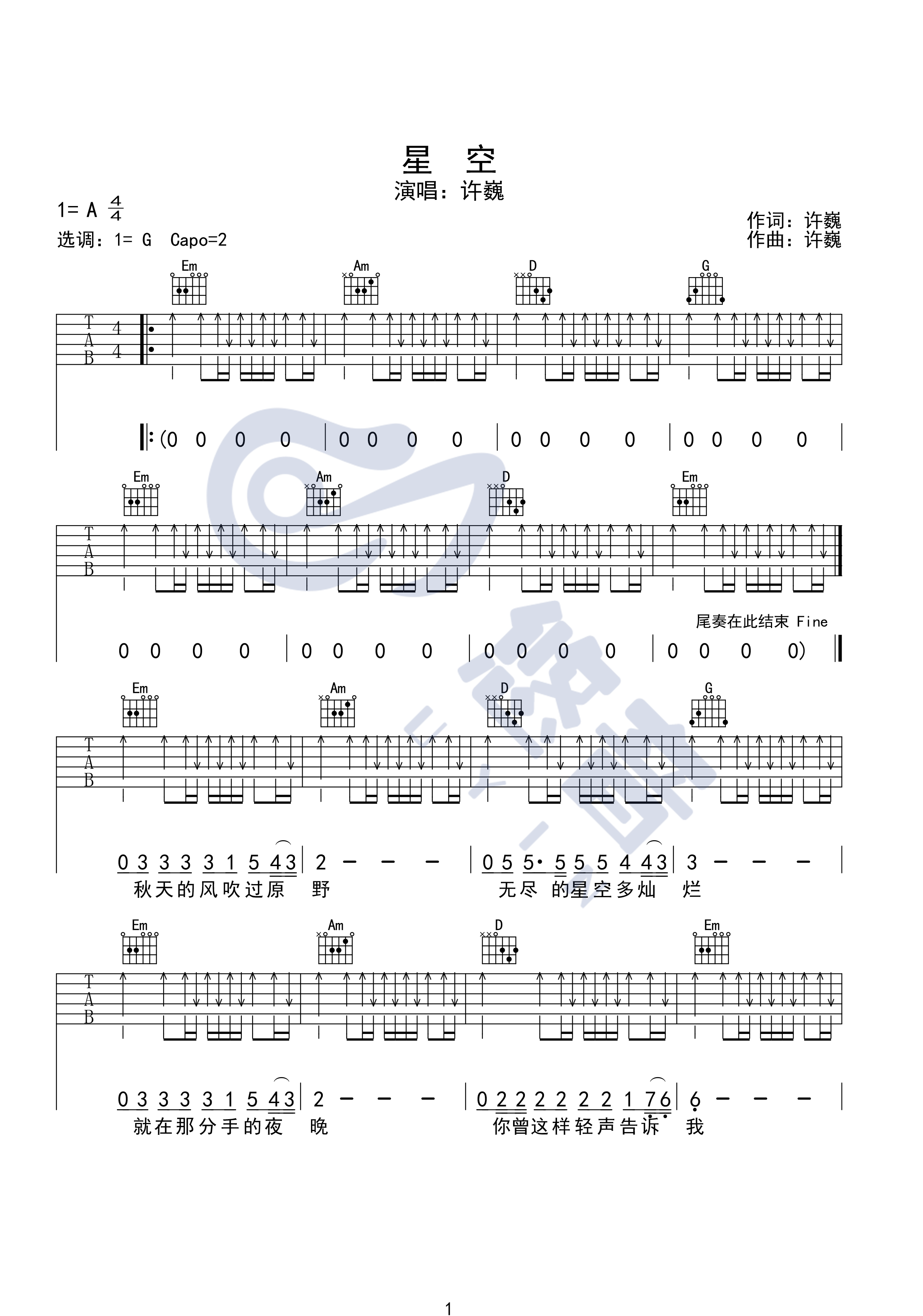 星空吉他谱 - 许巍 - G调吉他弹唱谱