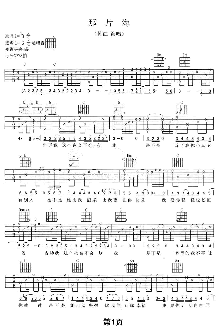 那片海吉他谱 - 韩红 - G调吉他弹唱谱