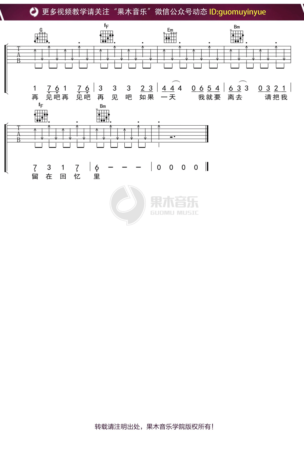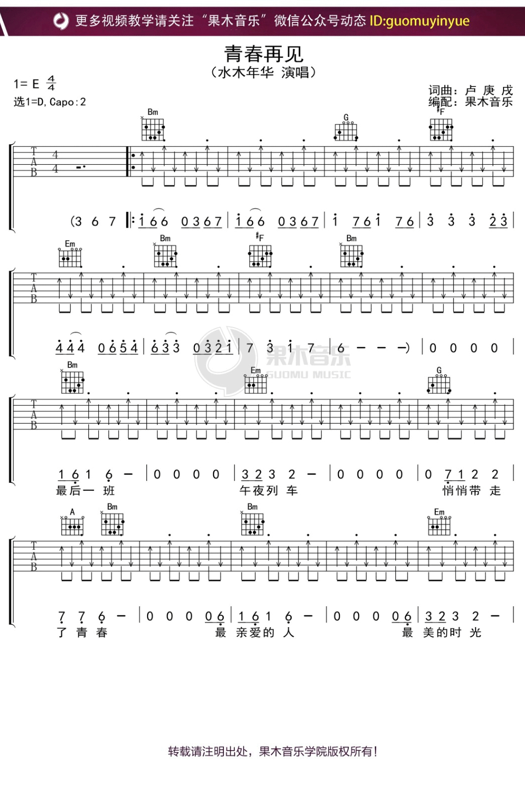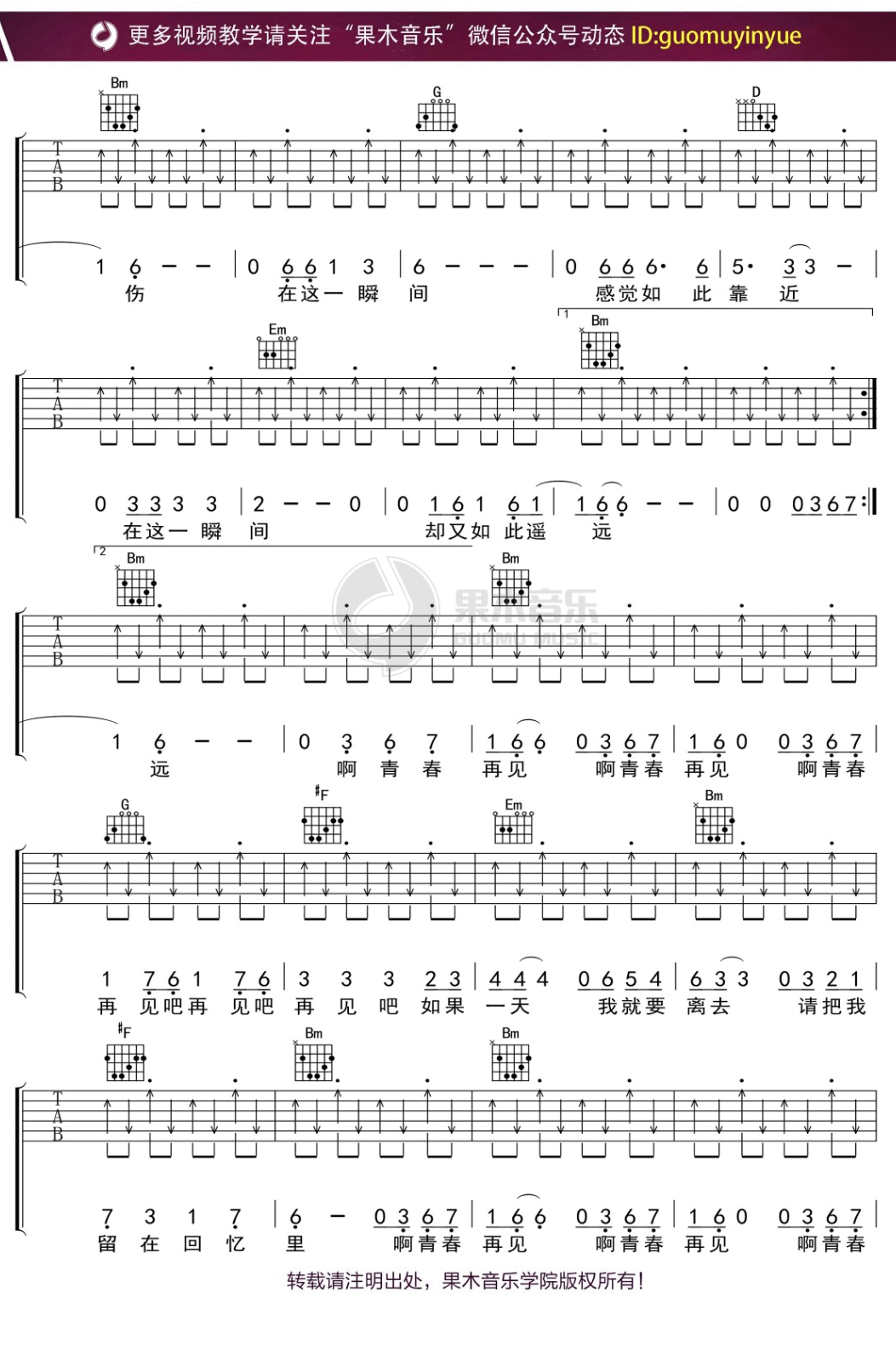 曲谱介绍: 《青春再见》吉他谱_水木年华_D调简单版弹唱谱_高清六线谱分享,《青春再见》是电影《怒放》(怒放之青春再见)的首支概念单曲,歌曲中部分曲调引用意大利歌曲《啊朋友再见》。