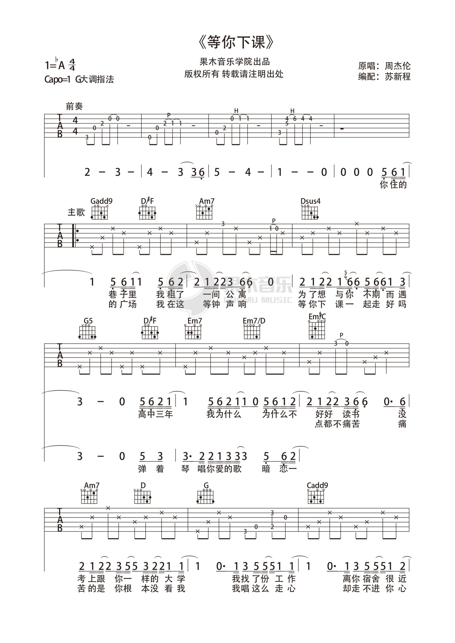 等你下课吉他谱 - 周杰伦 - G调吉他弹唱谱