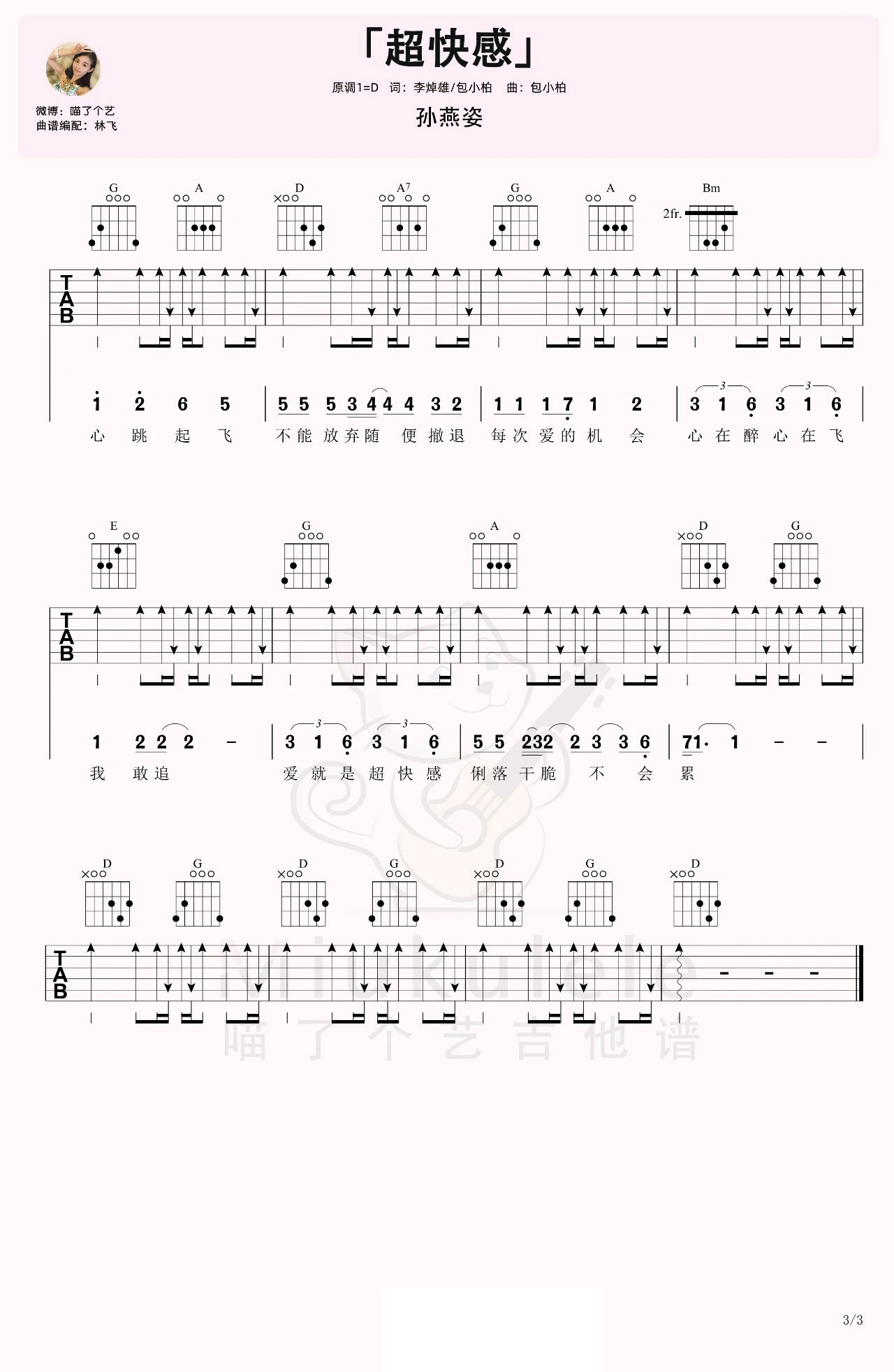 曲谱介绍: 超快感吉他谱_孙燕姿_《超快感》D调弹唱谱_高清六线谱分享,《超快感》是由孙燕姿演唱的一首歌,从来没有一种速度,可以像爱情超快感一样翻山越岭。这是一首从头到尾让人酣畅淋漓的快节奏歌曲,非常有律动感,听歌时忍不住一直点头打节奏。它没有缠绵悱恻的爱恋细语,更没有电音节奏的浮躁催促,只是以百分之百的天然心态自我剖白。“没有人跟幸福作对没有时间浪费,做好全部心理准备心跳起飞”这样的唱句也同样留在了所有歌迷的心中,每次回味这难忘的初见,感觉都像当时第一眼一样清新明朗。